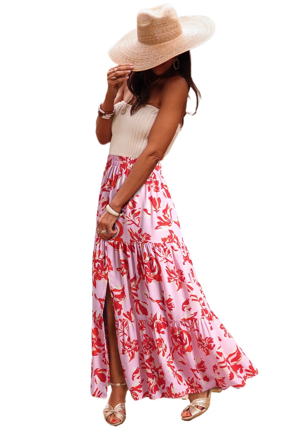 Women’s Pink Bohemian Floral Print Maxi Skirt – Long Tiered Design with Chic Split