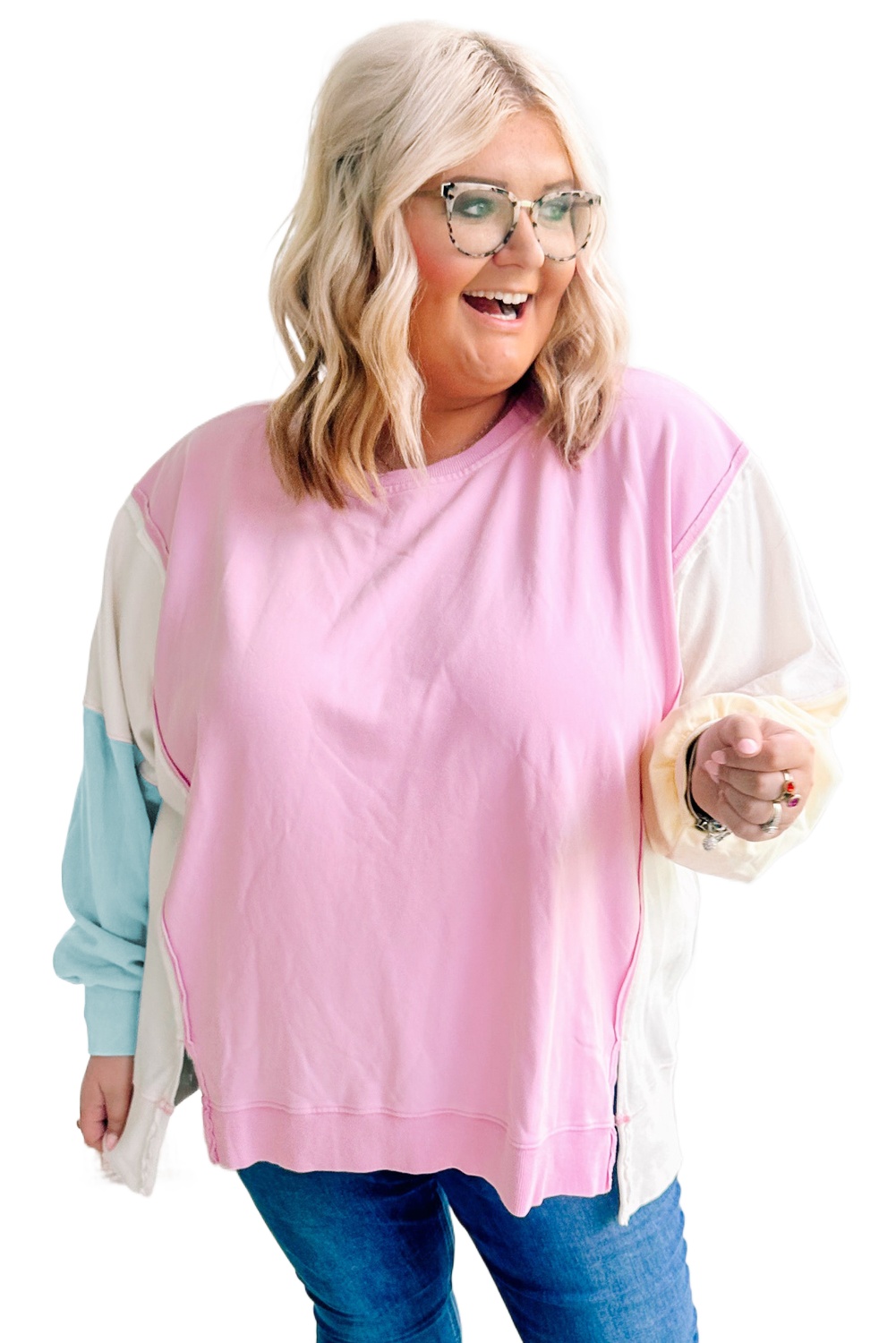 Women’s Pink Colorblock Patchwork Drop Shoulder Sweatshirt – Plus Size Casual Daily Wear for Fall Comfort