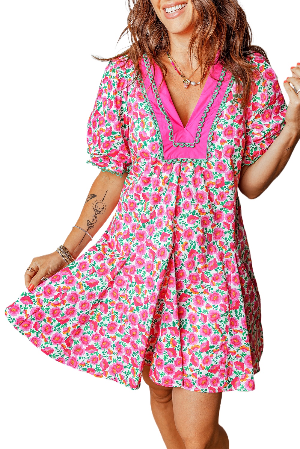 Women’s Pink Floral Print V Neck Mini Dress – Casual Short Sleeve Summer Style