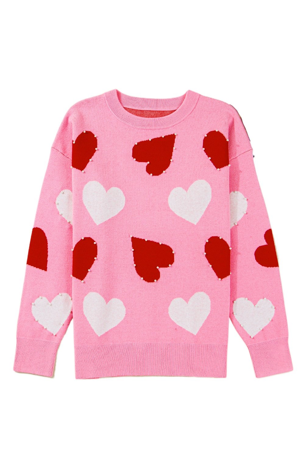 Women’s Pink Heart Pattern Sweater with Pearl Embellishments