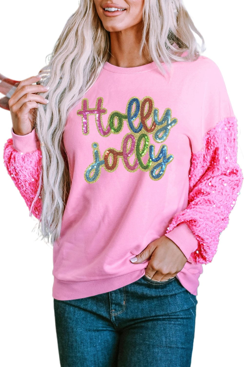 Women’s Pink Holly Jolly Sequin Letter Graphic Long Sleeve Top – Festive and Fun for Holiday Gatherings