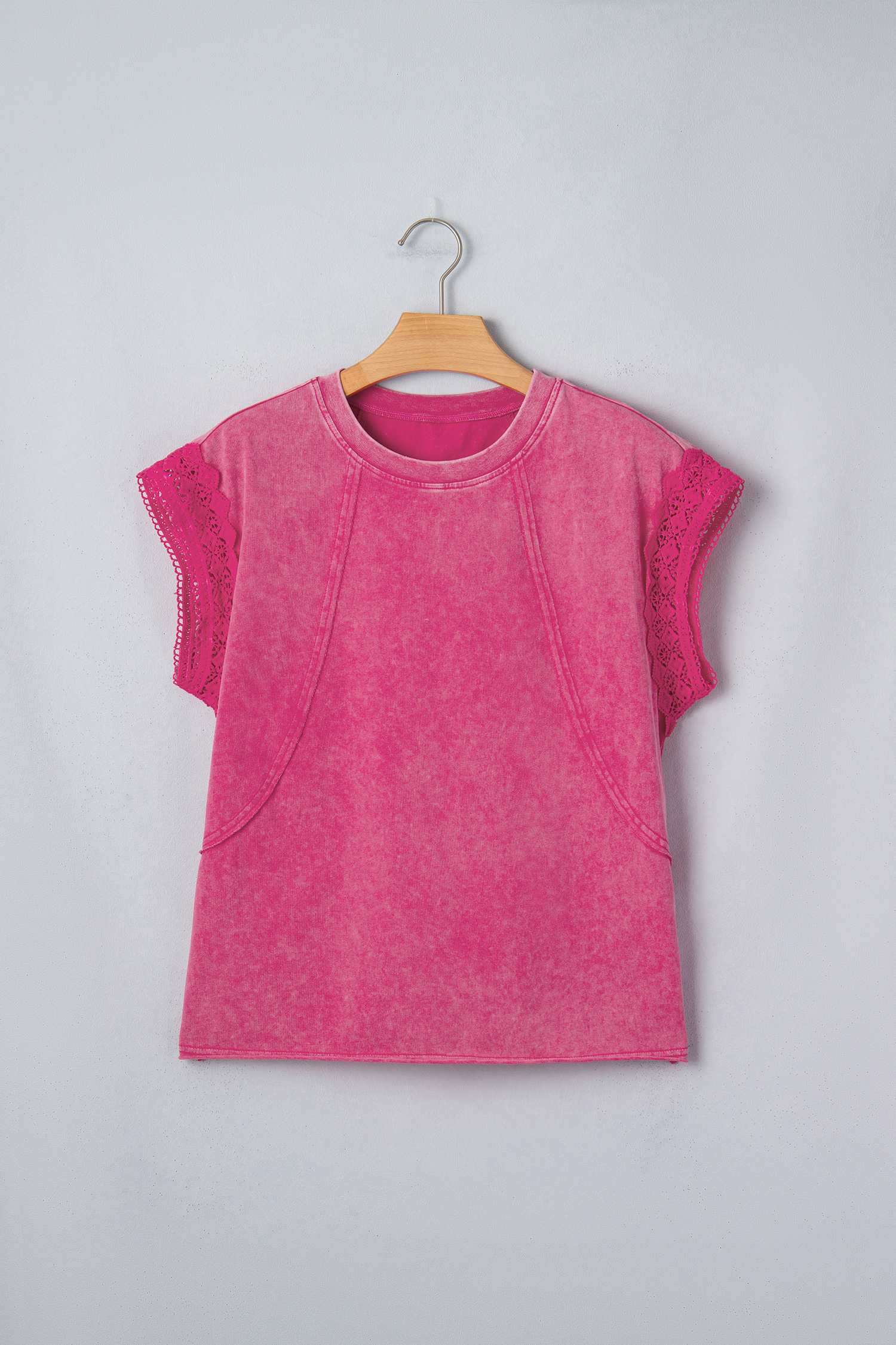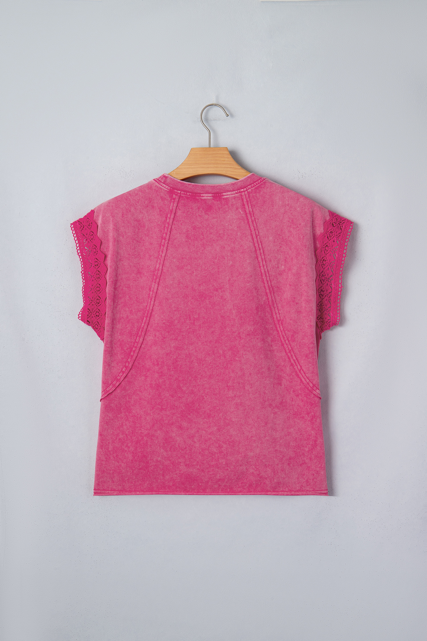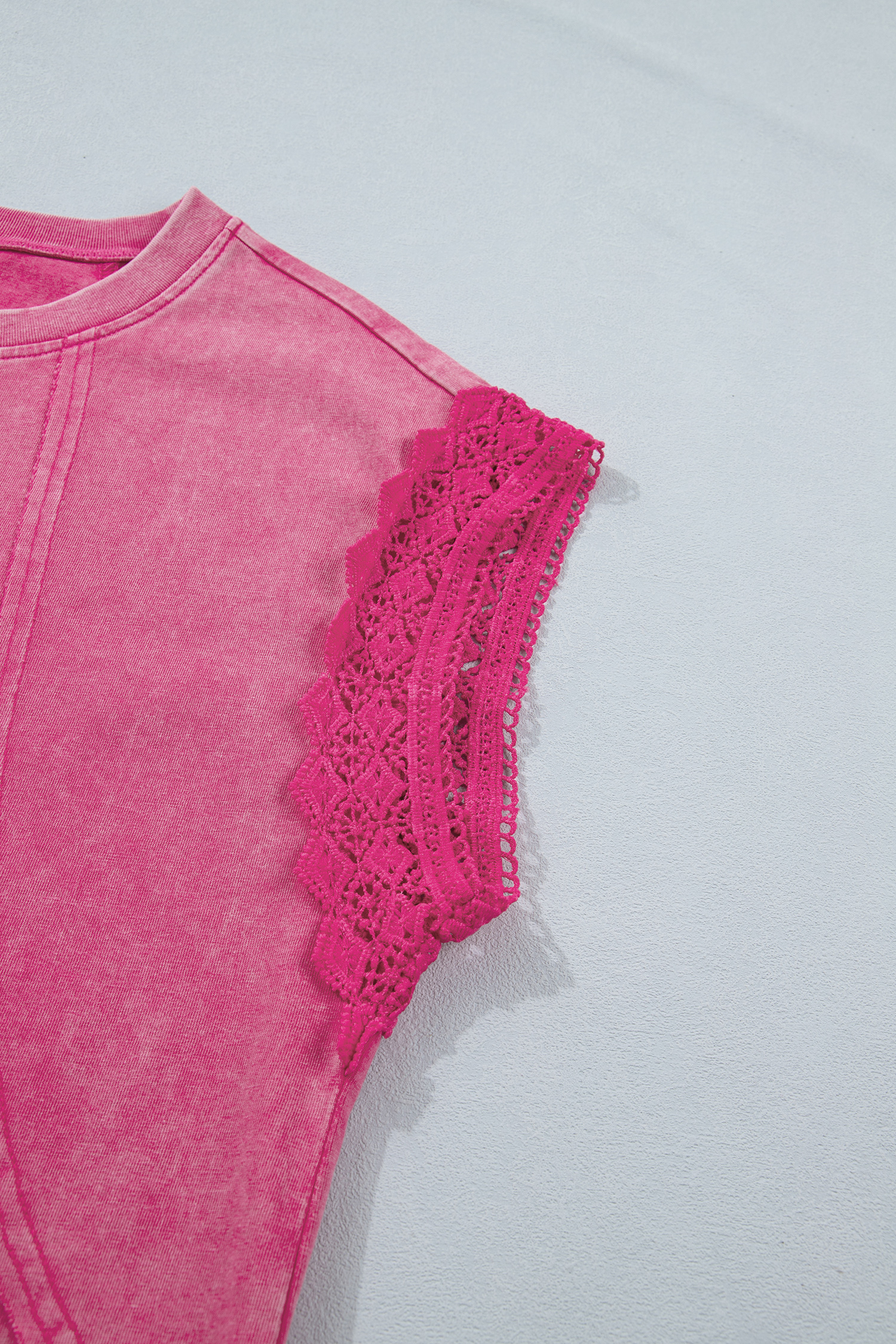 Women’s Pink Mineral Wash Cap Sleeve Top – Lace Trim and Raw Seam Detail, Casual Cotton Shirt