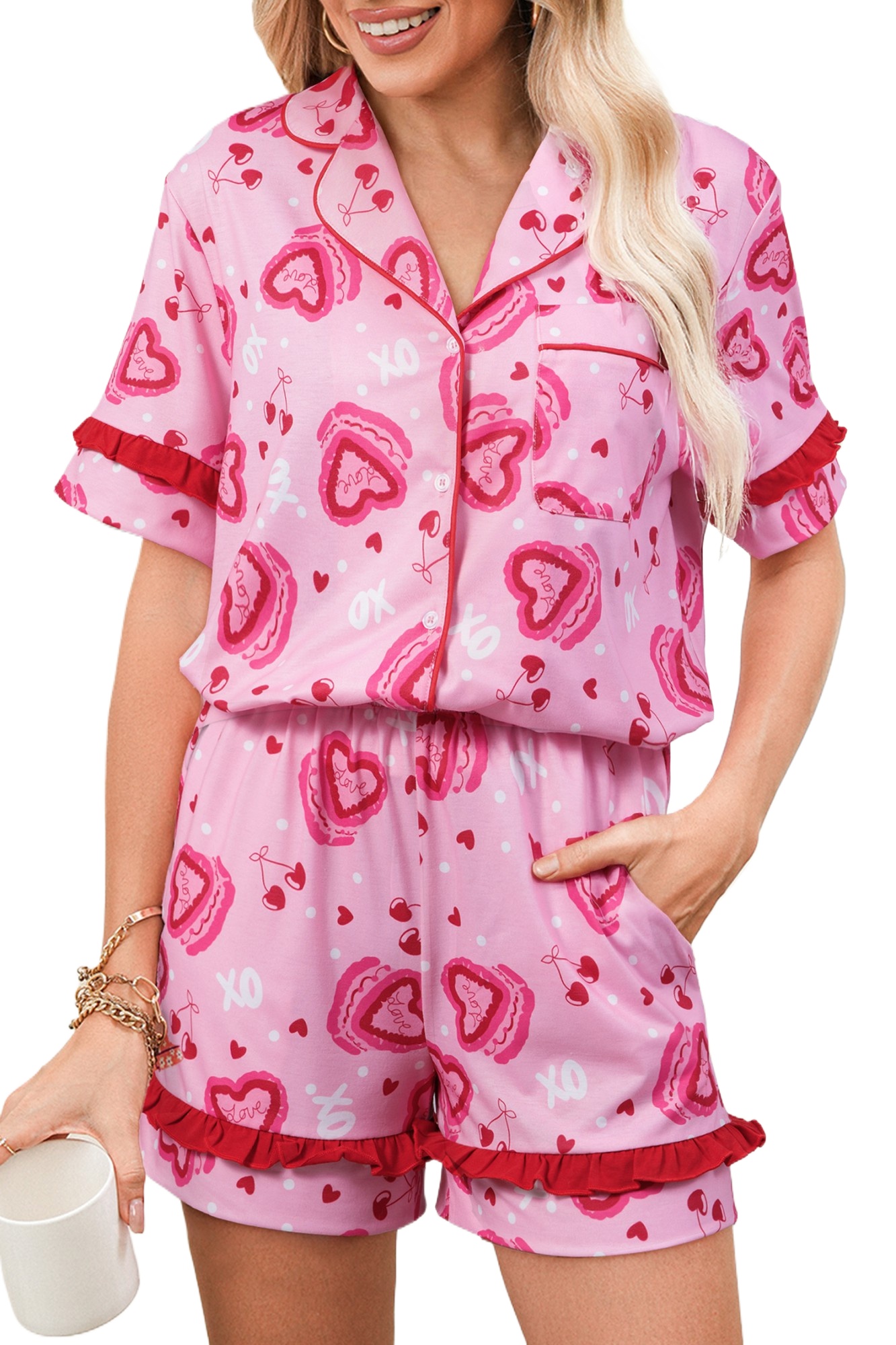 Women’s Pink Sweet Heart Cake Print Pajama Set – Ruffle Trim for Cozy Valentine Nights