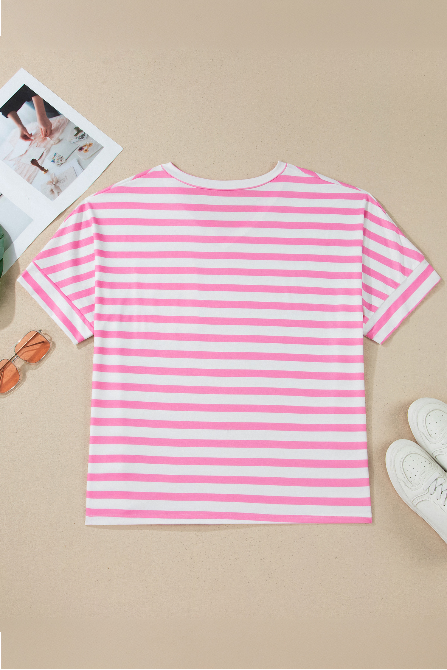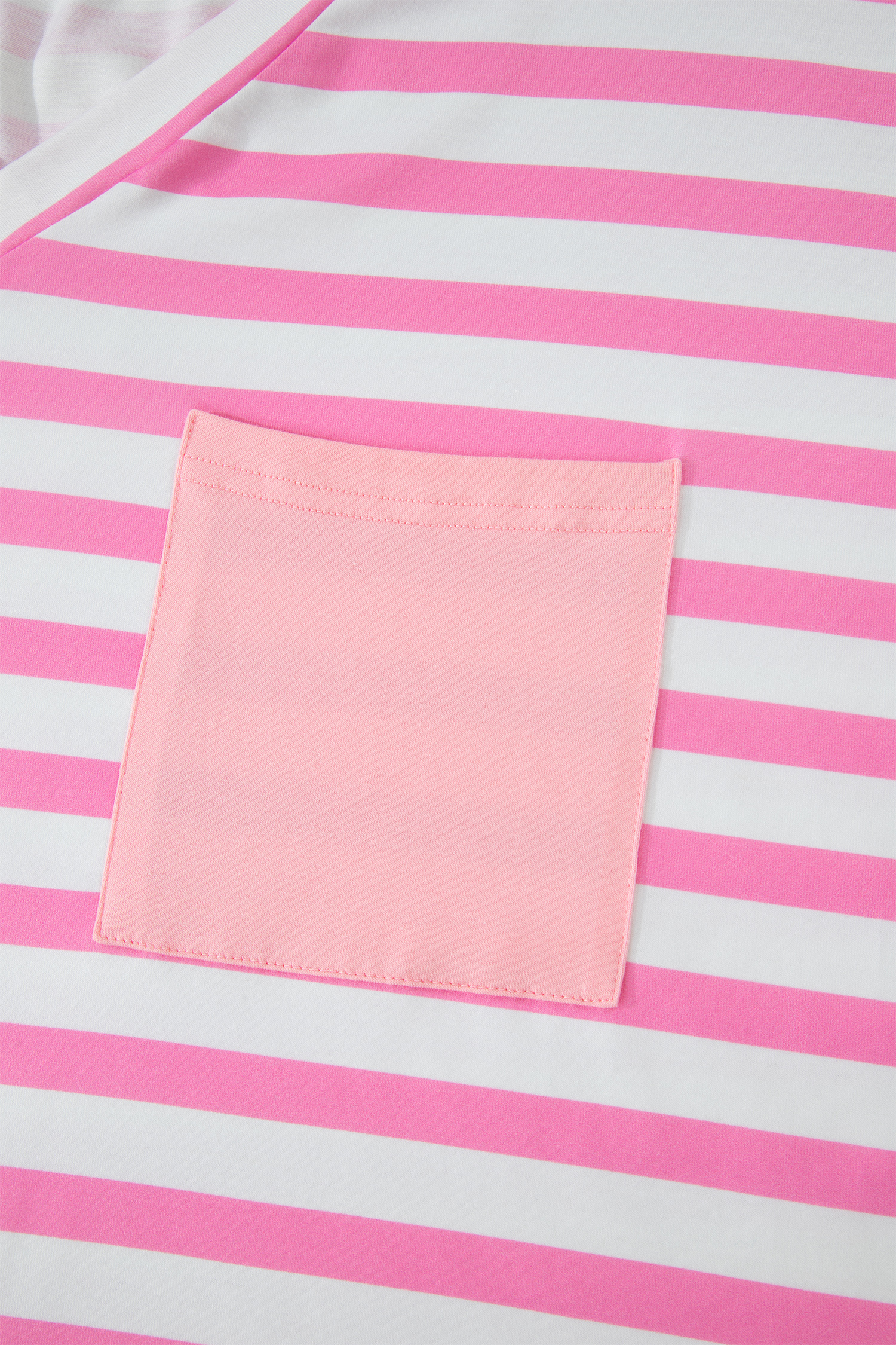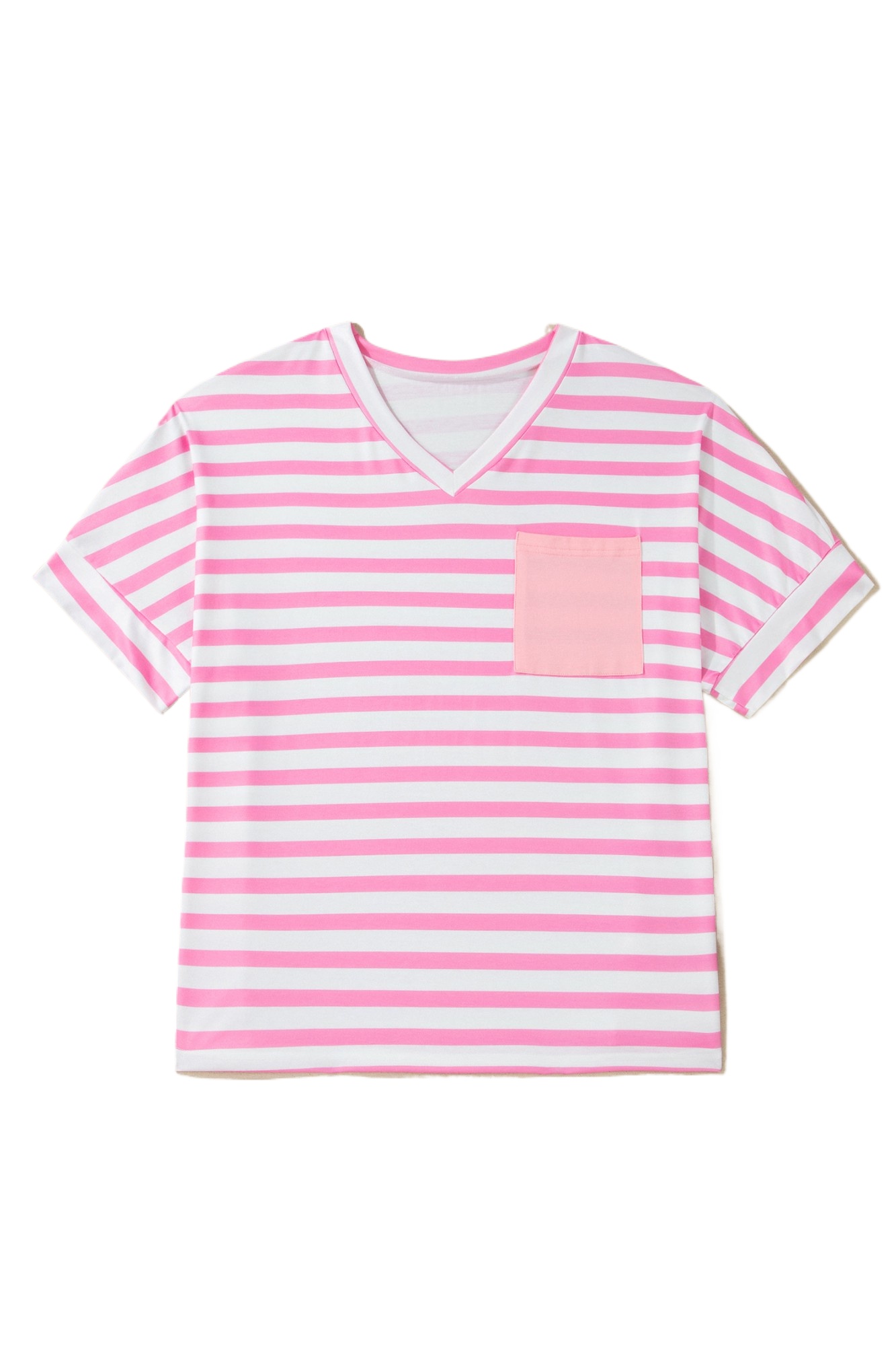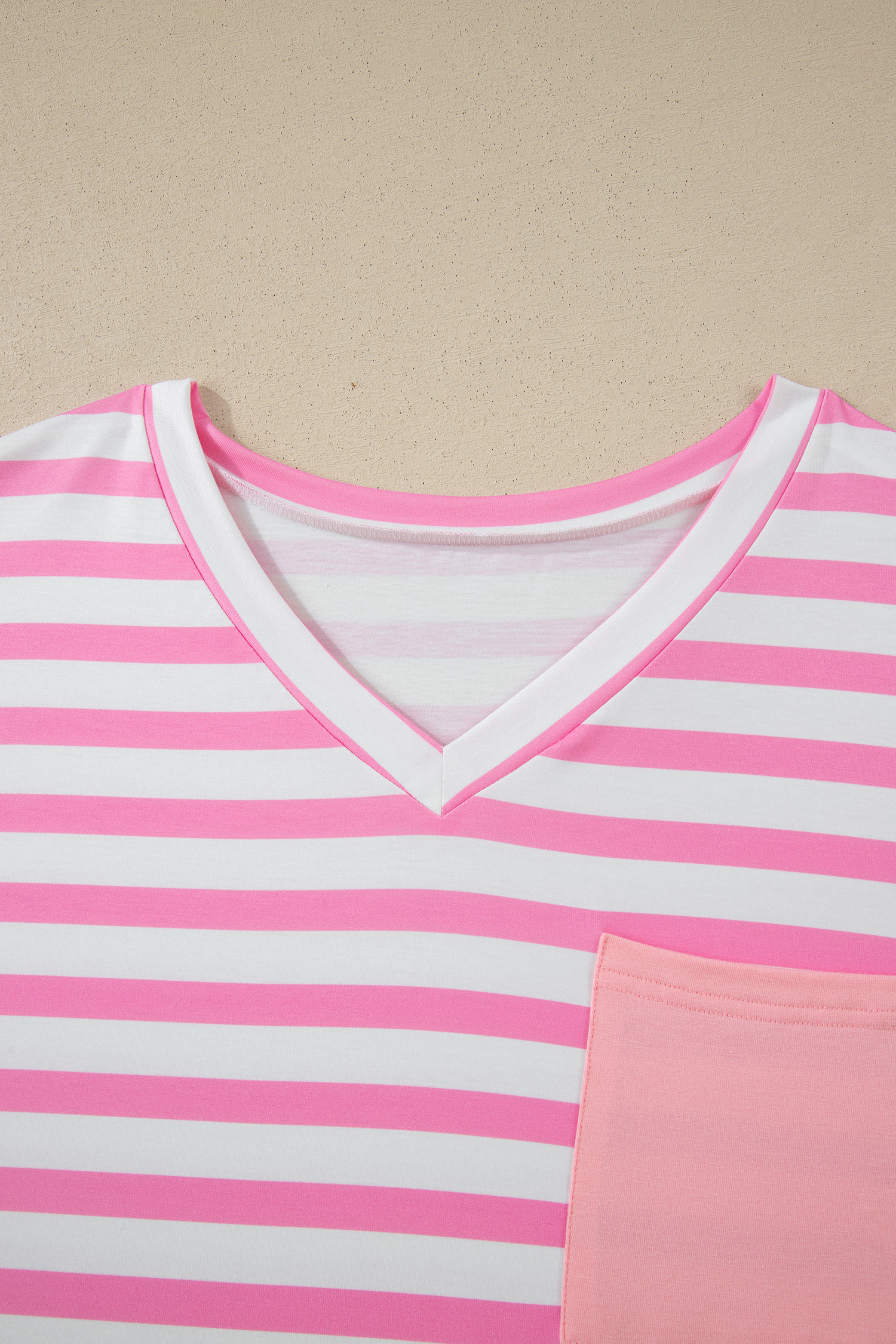Women’s Plus Size Pink Stripe Tee – Short Sleeve V Neck Colorblock Shirt with Pocket