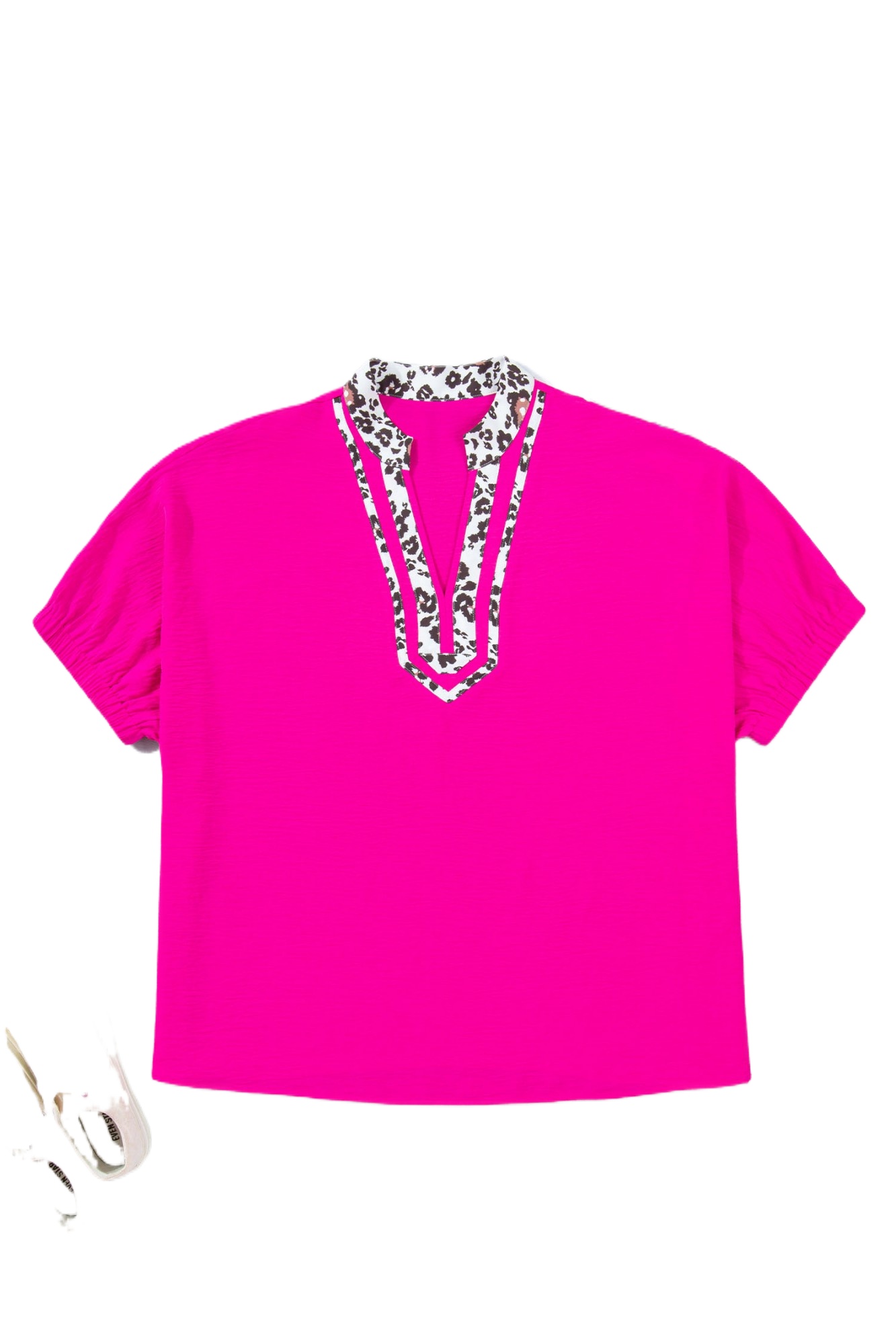 Women’s Plus Size Rose Red Top – Leopard Print Colorblock V-Neck Short Sleeve Shift Blouse