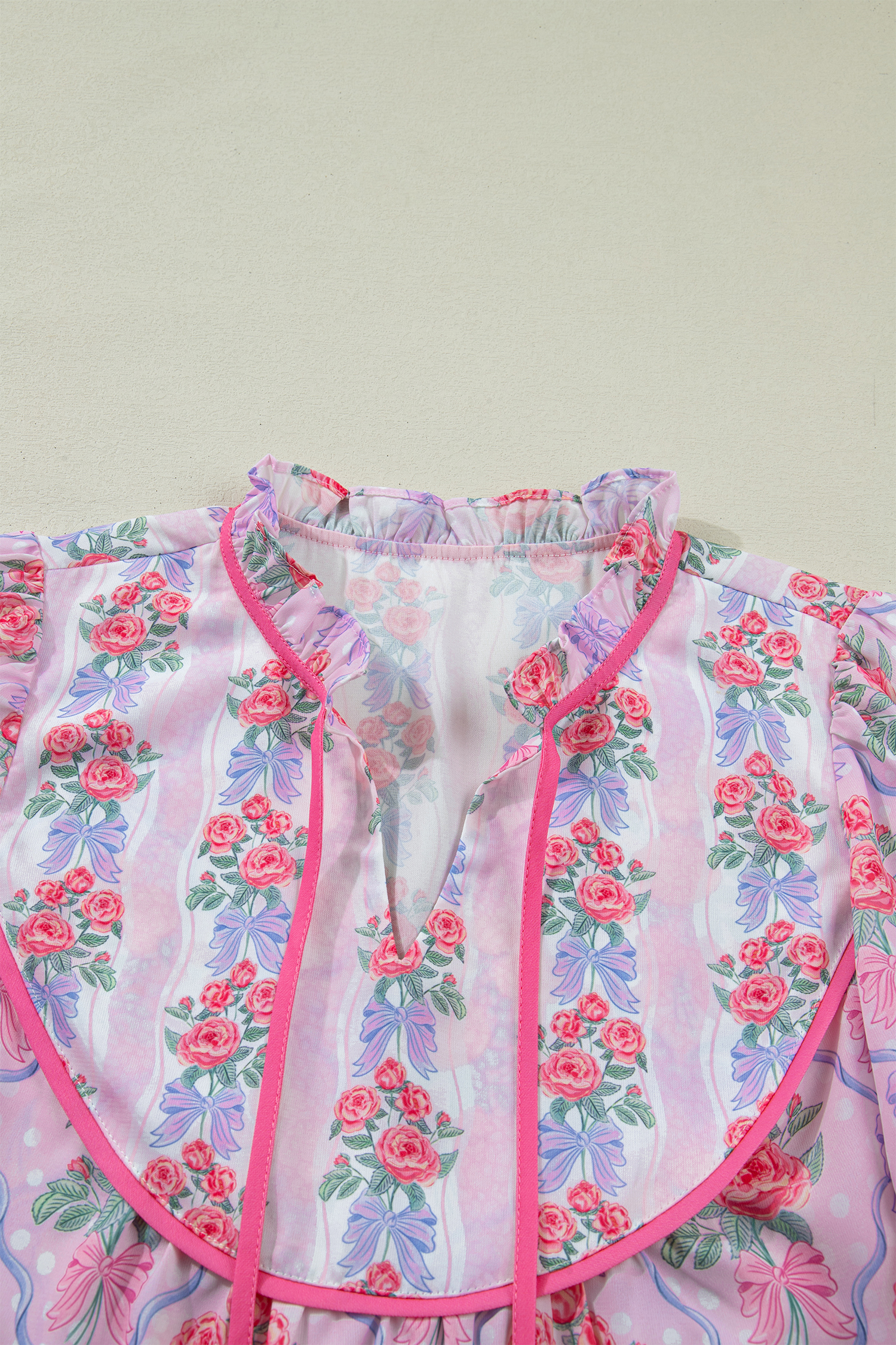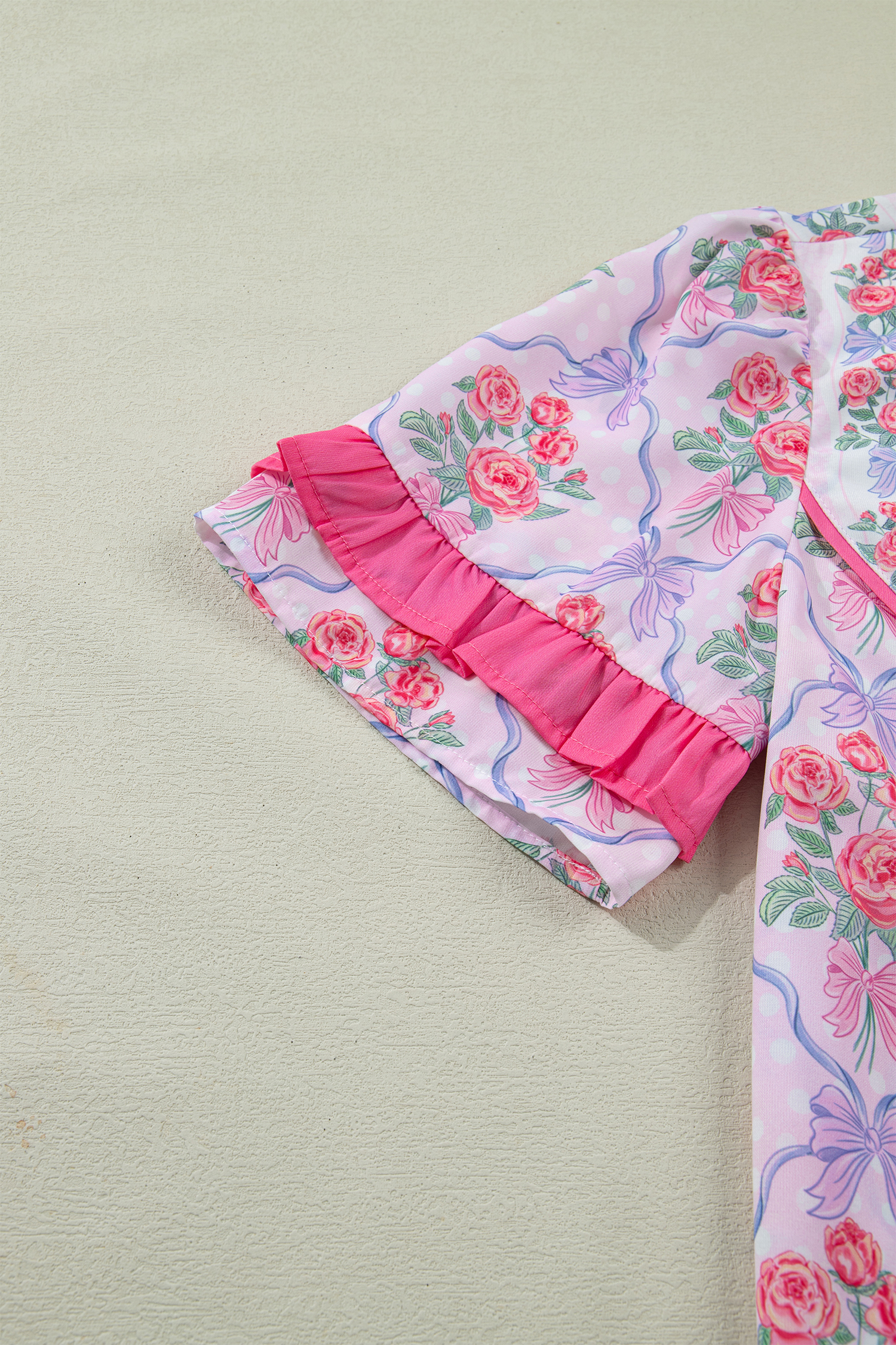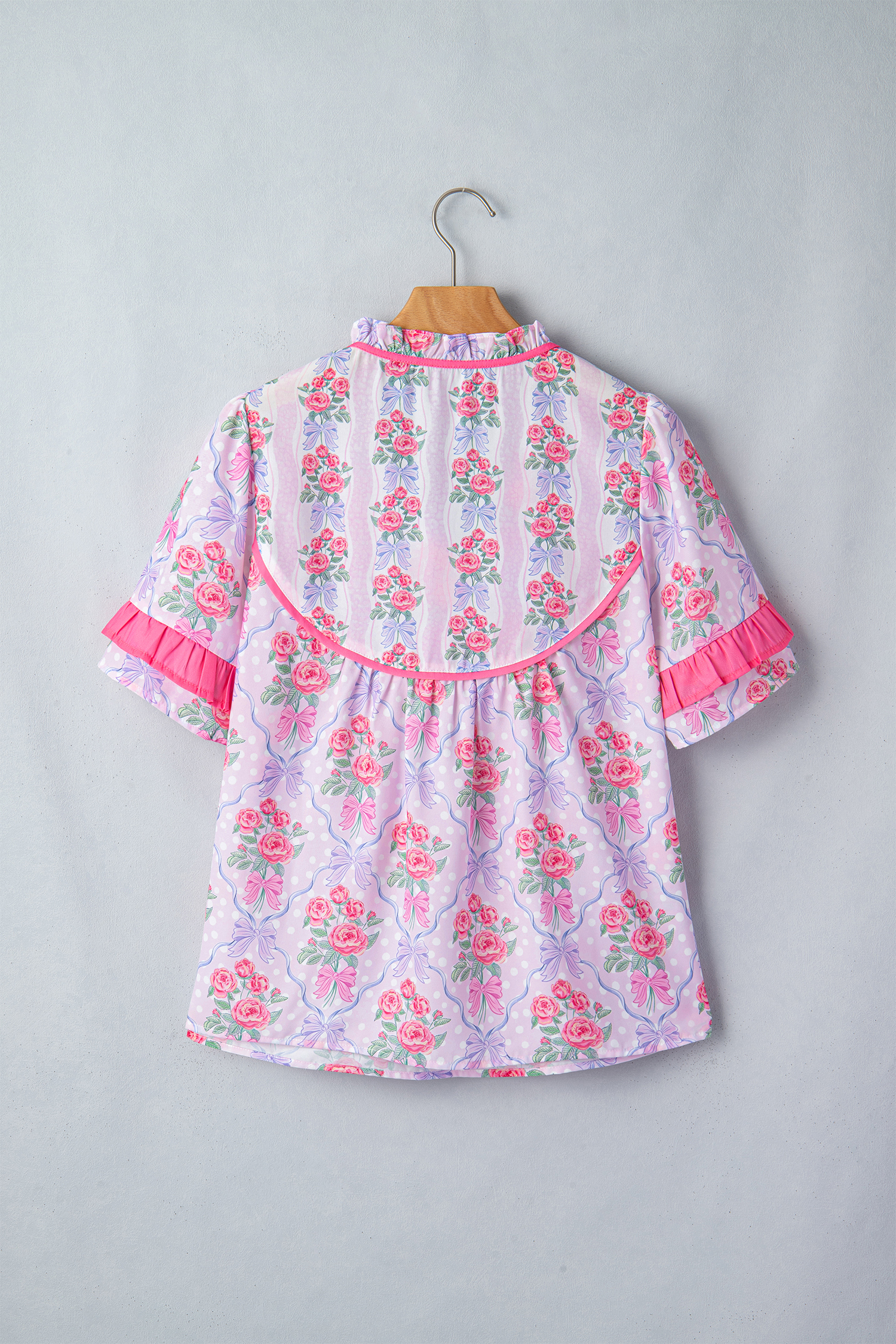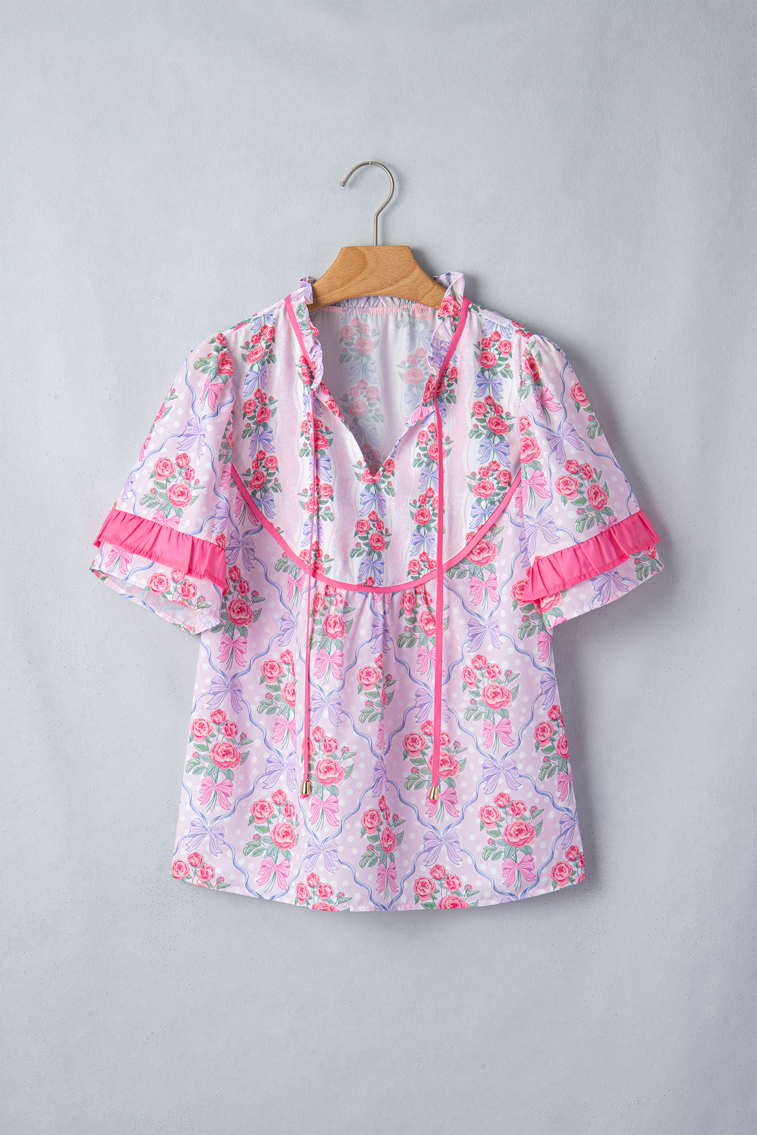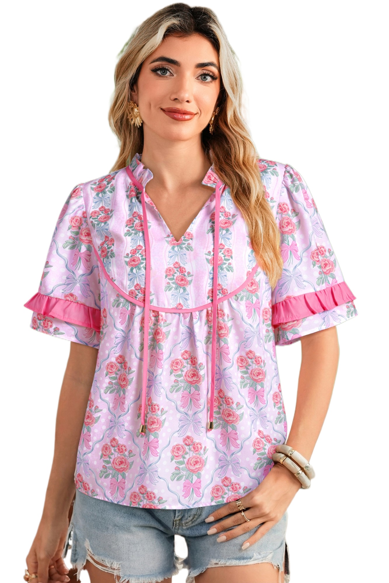 Women’s Purple Floral Coquette Blouse – Ruffled Short Sleeve V-Neck Top with Bow Detail