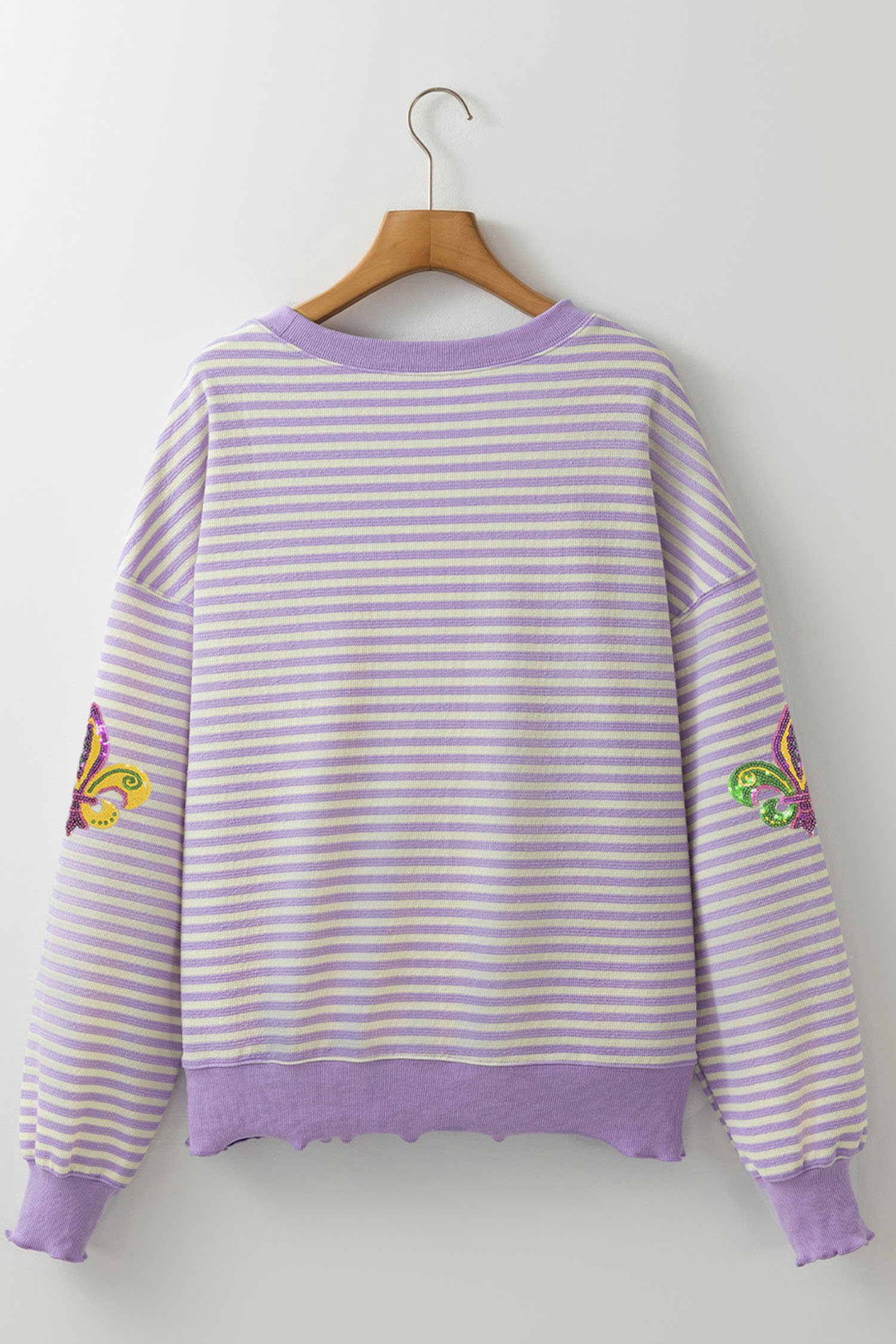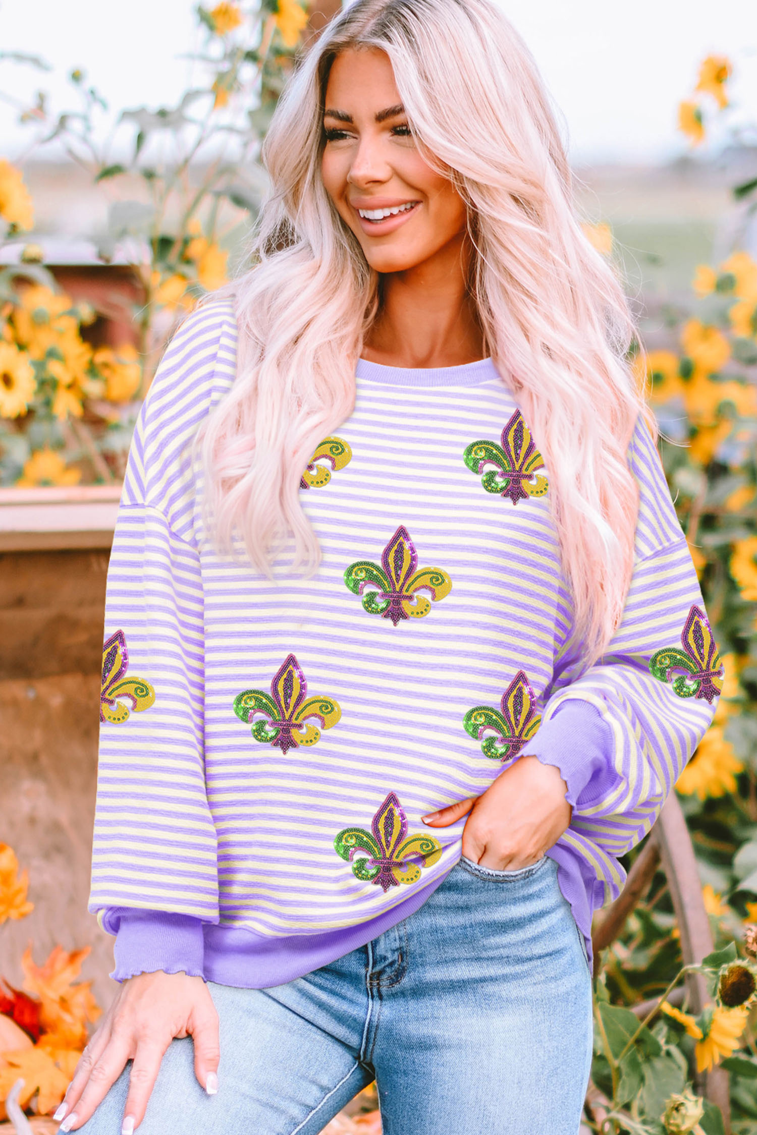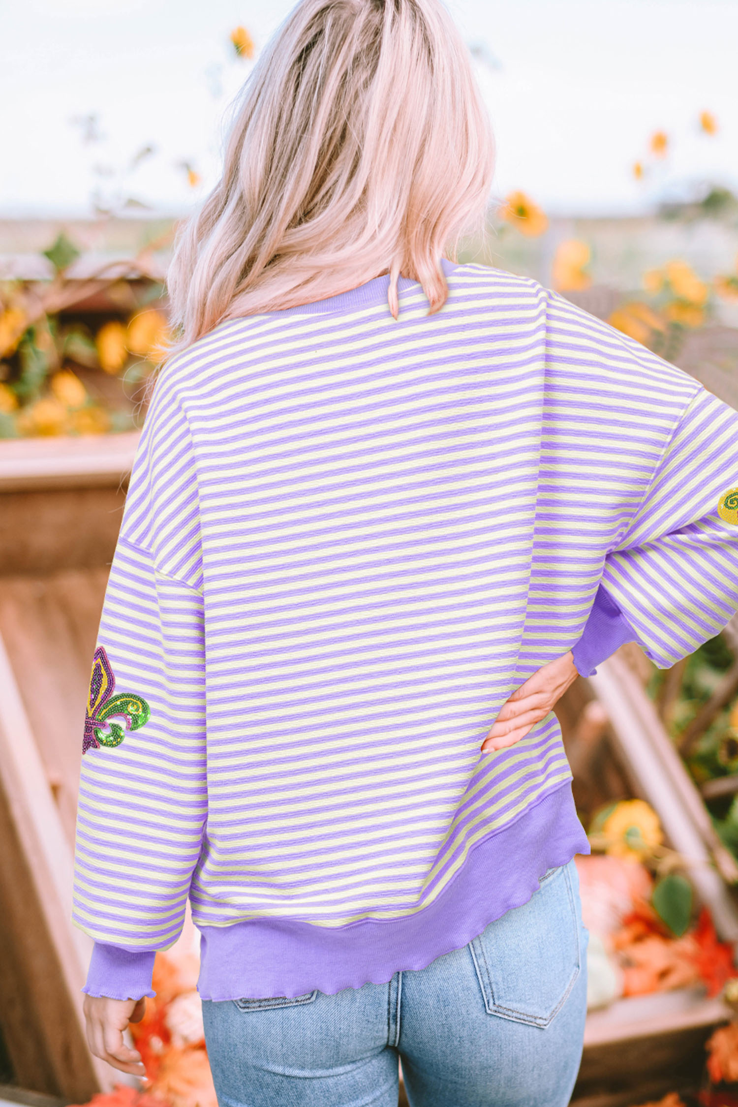 Women’s Purple Stripe Sequin Long Sleeve Top – Casual Color Block Patchwork for Mardi Gras