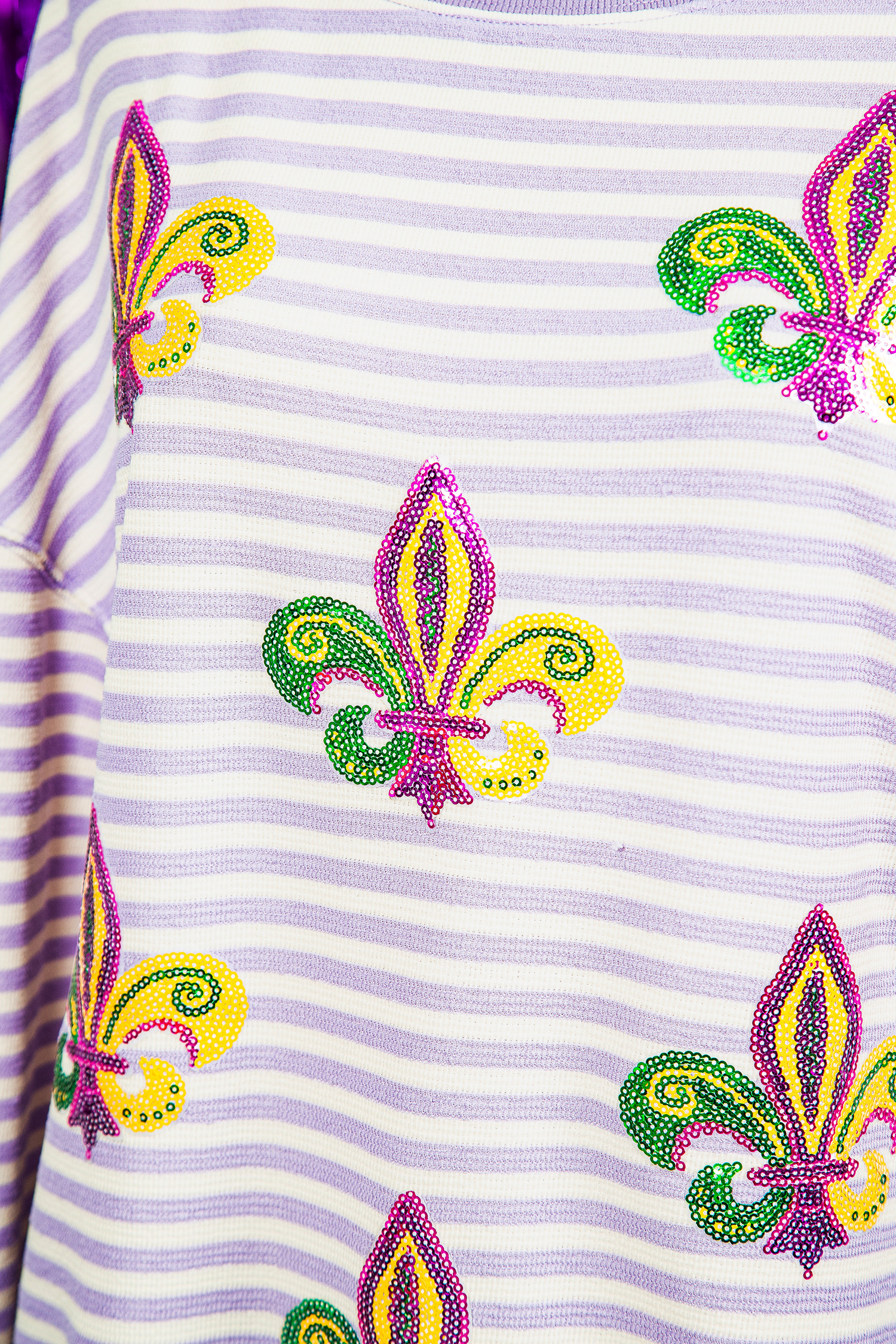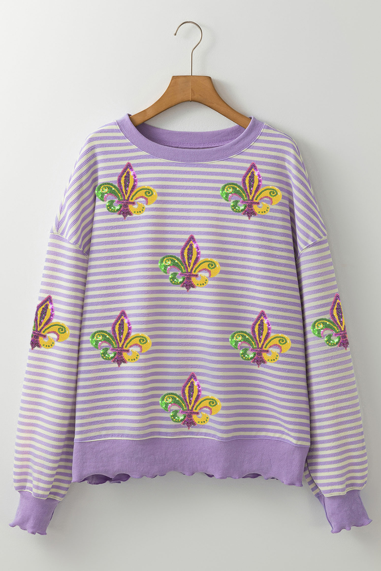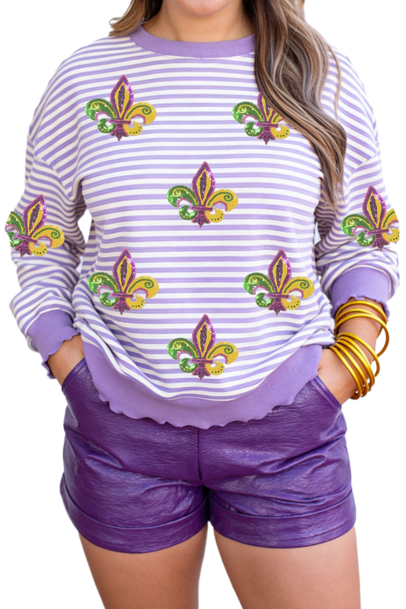 Women’s Purple Stripe Sequin Long Sleeve Top – Casual Color Block Patchwork for Mardi Gras