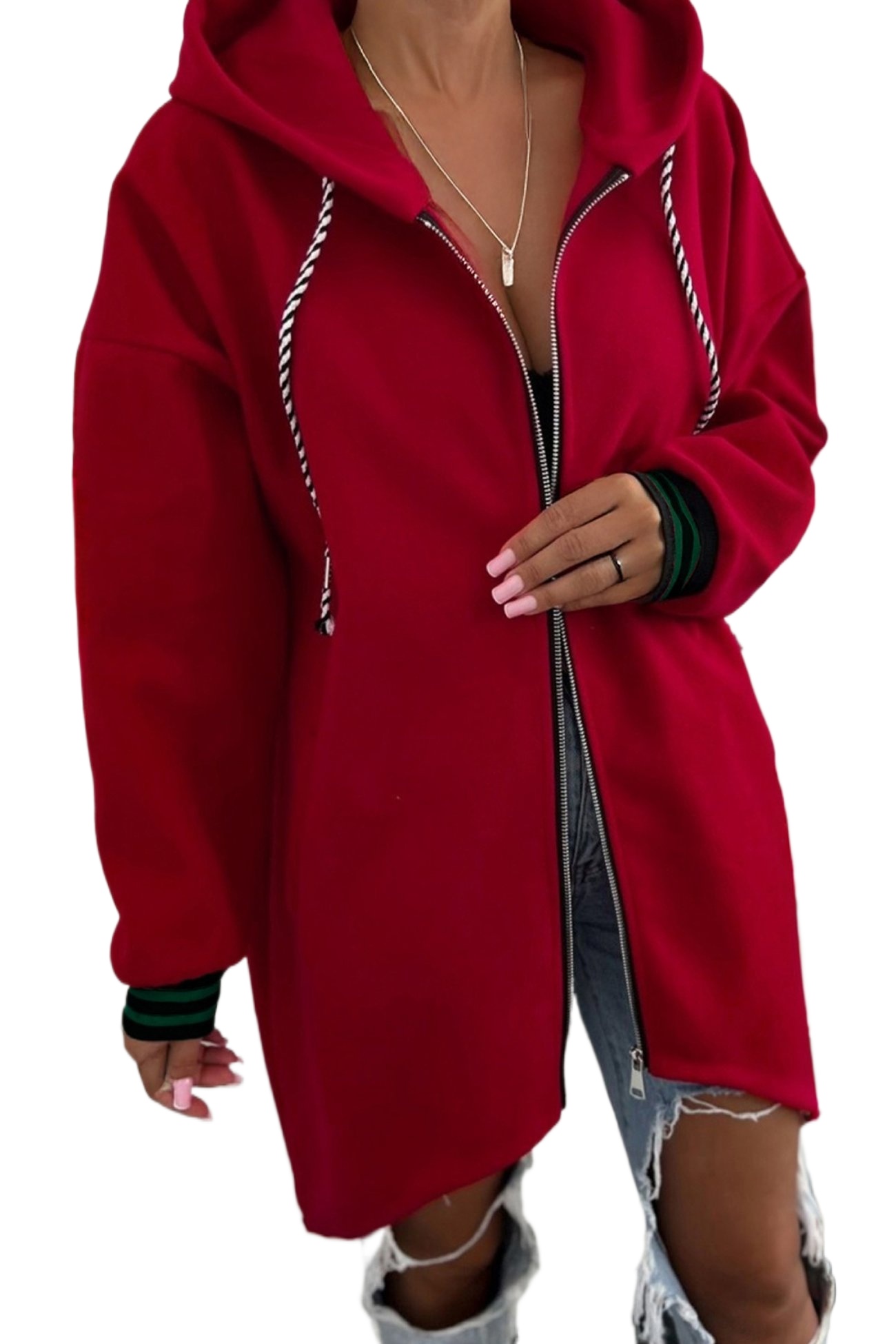 Women's Racing Red Cuffed Drop Shoulder Hoodie – Casual Zip-Up Tunic for Daily WearWomen’s Racing Red Cuffed Drop Shoulder Hoodie – Casual Zip-Up Tunic for Daily Wear