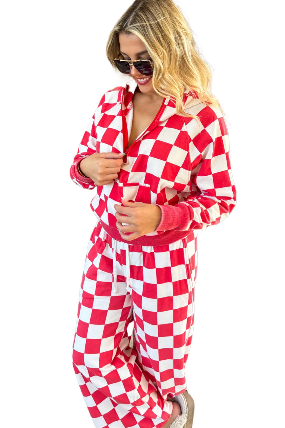 Women’s Red Checkered Half Zip Hoodie and Loose Pant Set for Daily Casual Wear