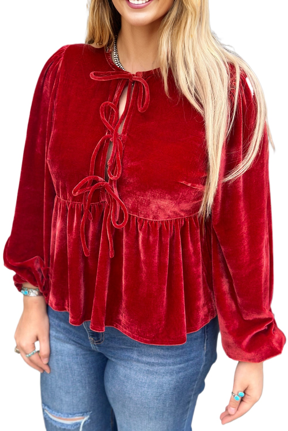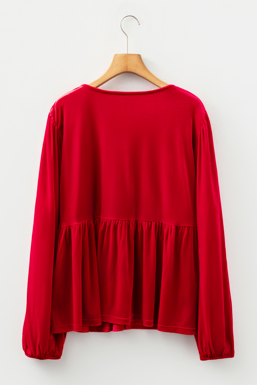Women’s Red Clay Velvet Peplum Blouse – Casual Tie Front Top for Daily Wear