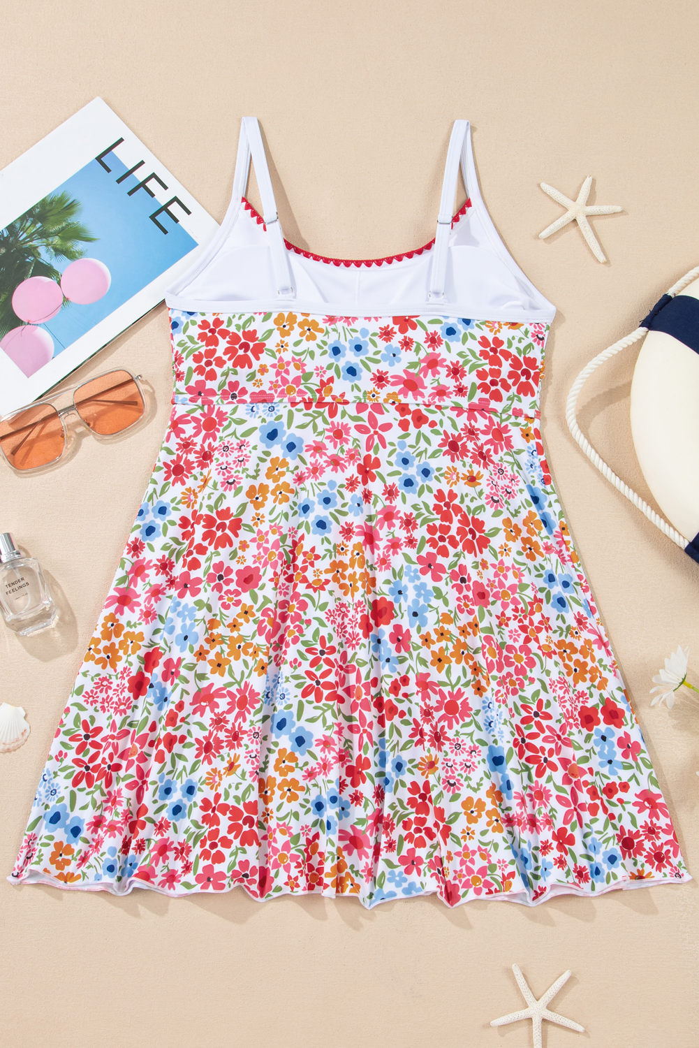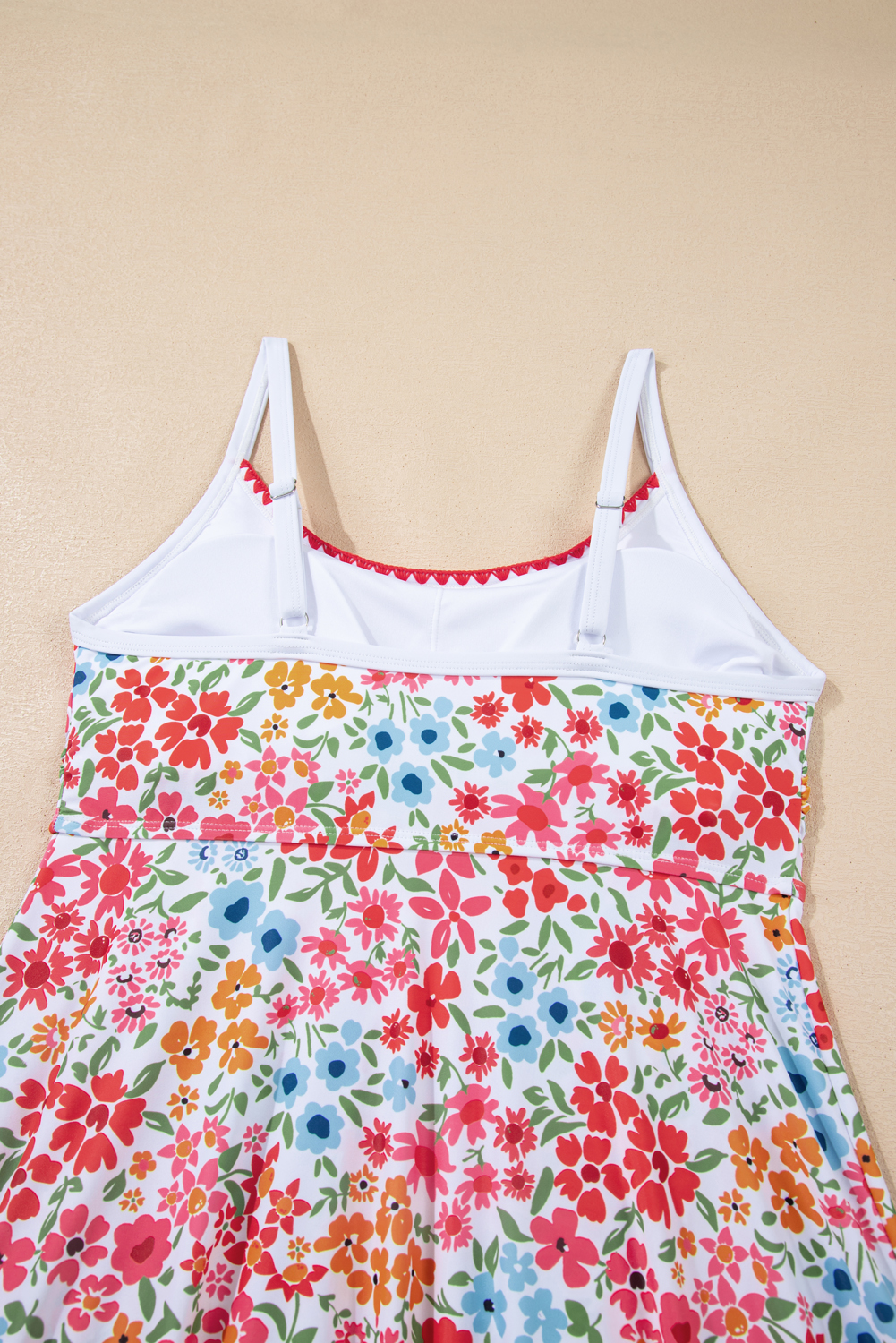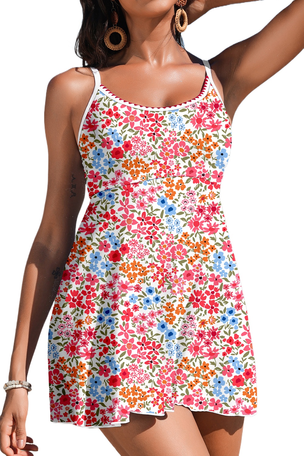 Women’s Red Floral Print Swim Dress – Boho Spaghetti Strap with Ricrac Trim for Summer Fun