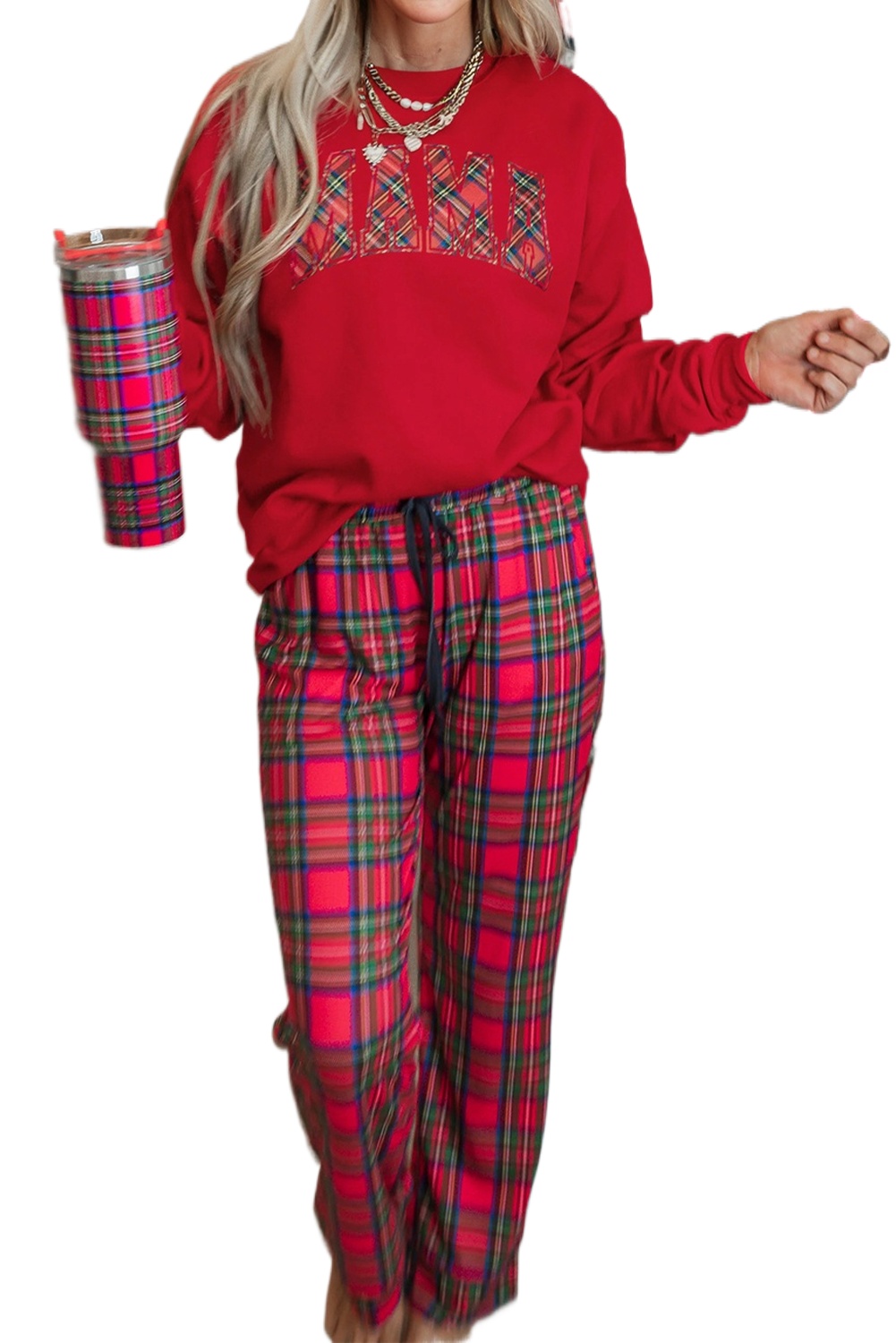 Women's Red Plaid Mama Graphic Christmas Lounge Set – Cozy Crewneck Pullover and Pants for Holiday Relaxation - Main ViewWomen’s Red Plaid Mama Graphic Christmas Lounge Set – Cozy Crewneck Pullover and Pants for Holiday Relaxation