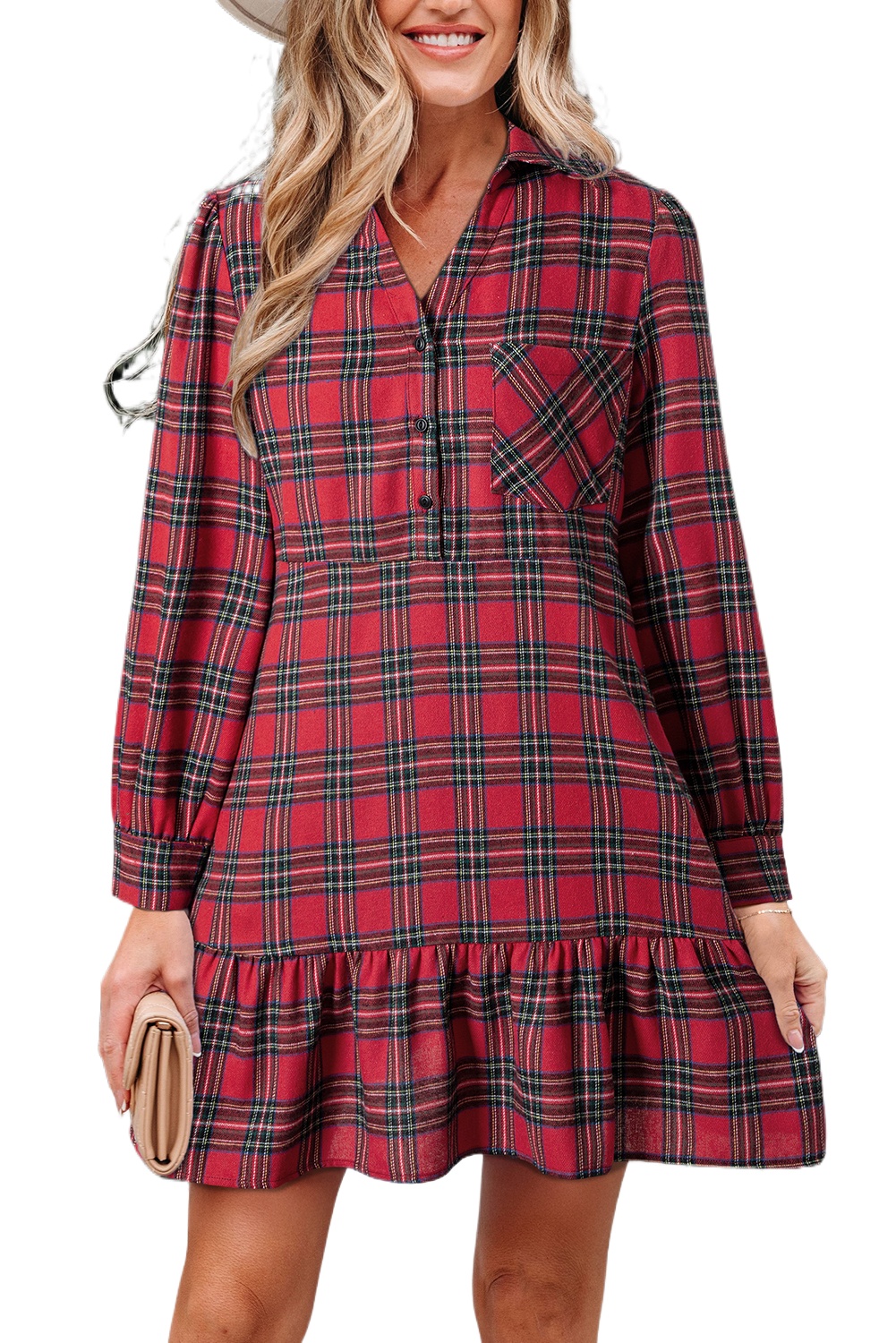 Women’s Red Plaid Mini Dress – Casual Long Sleeve Shift Dress with Ruffle Hem for Daily Wear