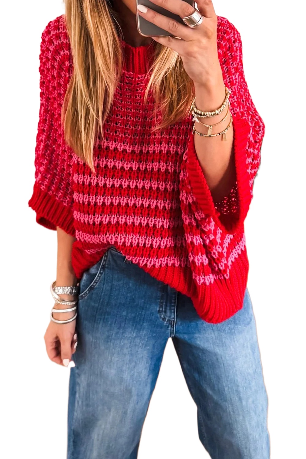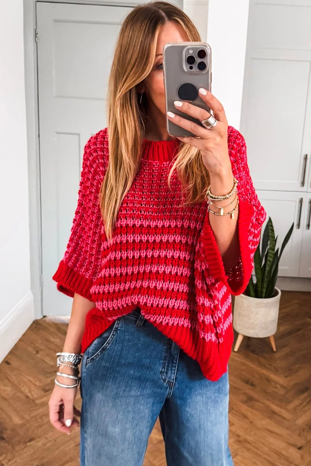 Women’s Red Stripe 3/4 Sleeve Slouchy Sweater – Casual Summer Knit for Daily Wear