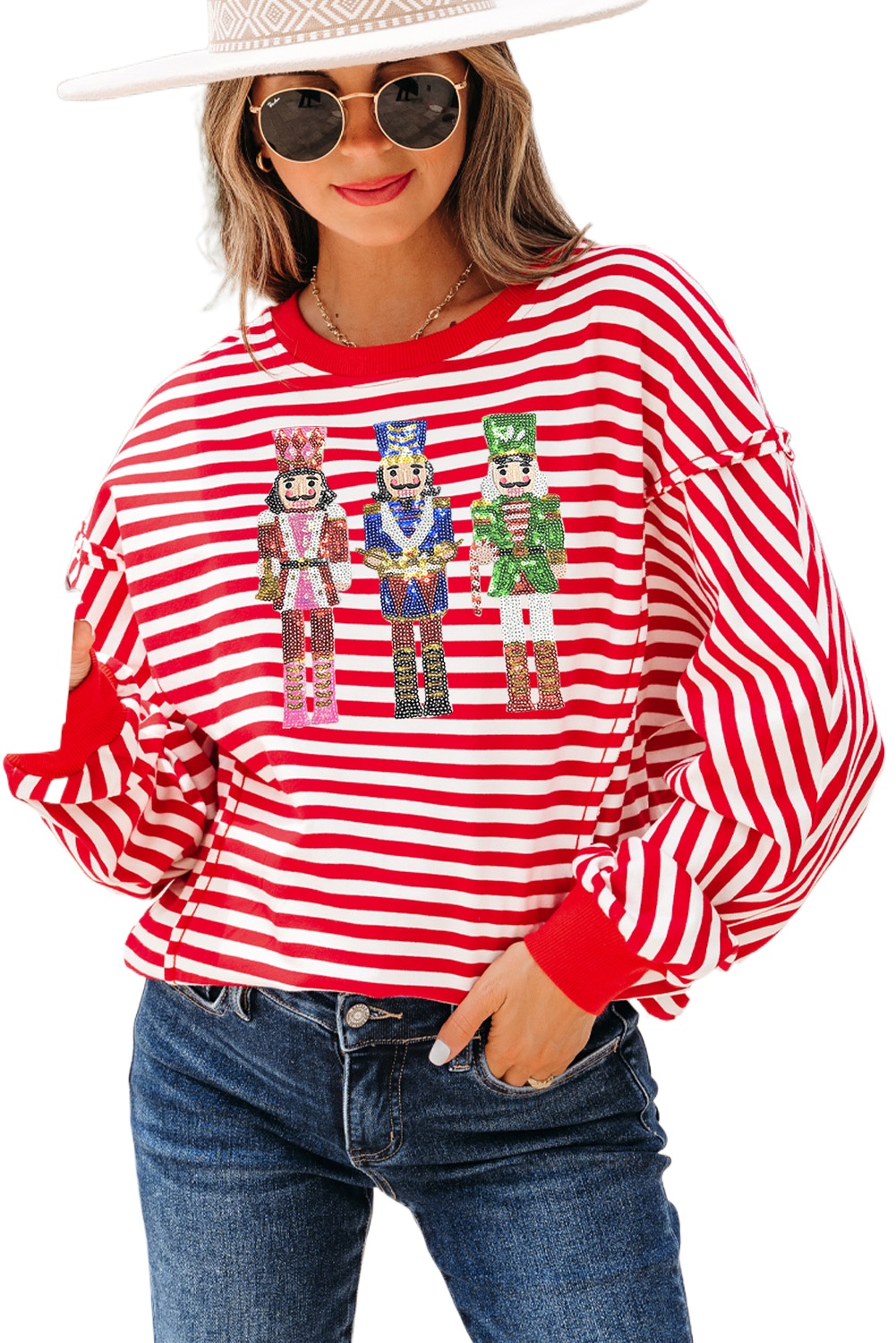 Women’s Red Stripe Christmas Nutcracker Sequin Patched Long Sleeve Top – Casual Daily Wear with Festive Flair