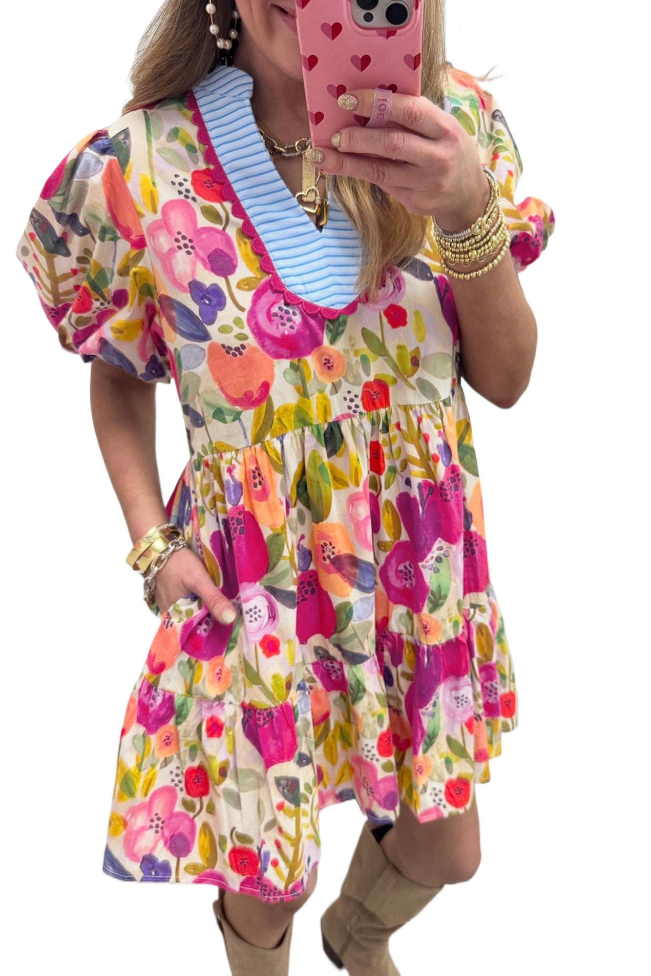 Women’s Rose Floral Print V-Neck Dress – Charming A-Line Design for Summer Gatherings