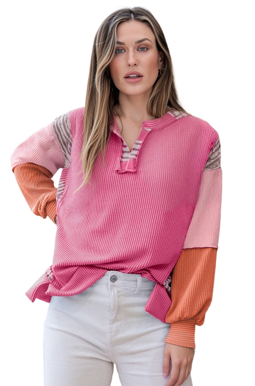 Women’s Rose Red Corded Plaid Patchwork Long Sleeve Top – Casual Daily Wear