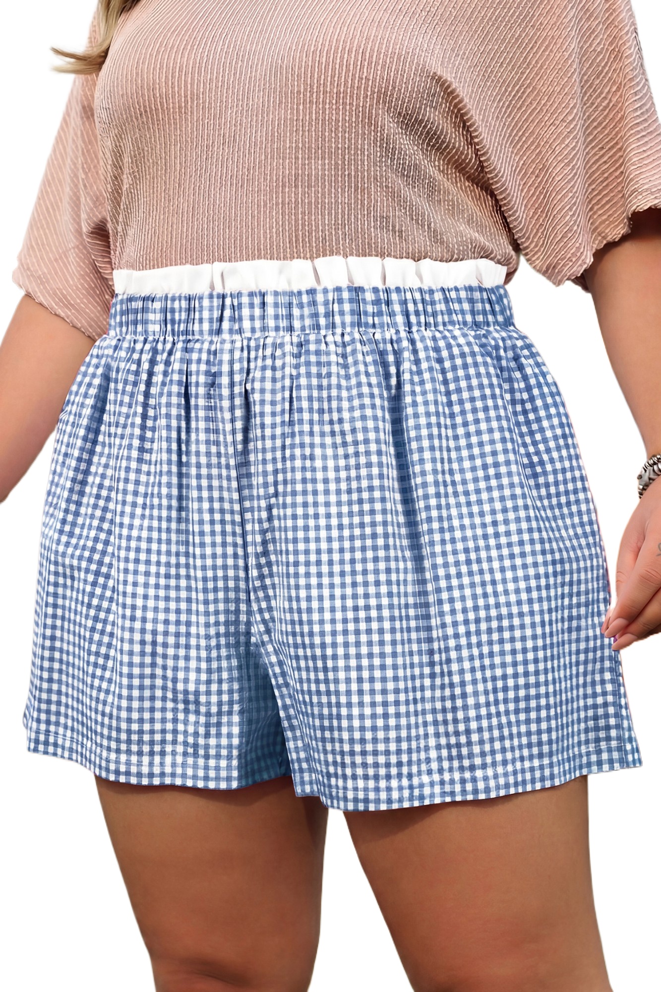 Women’s Sky Blue Contrast Trim Plaid Plus Size Shorts – Casual Summer Style for Everyday Wear