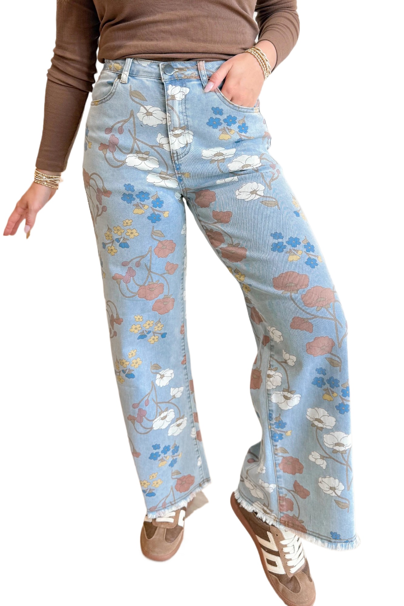 Women’s Sky Blue Floral Printed Shift Jeans – Casual High Waist Wide Leg Style for Daily Wear
