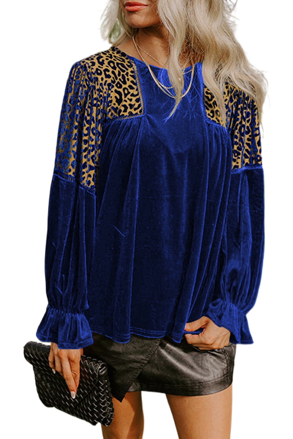 Women’s Sky Blue Leopard Patchwork Velvet Blouse – Flounce Sleeve Modern Office Top