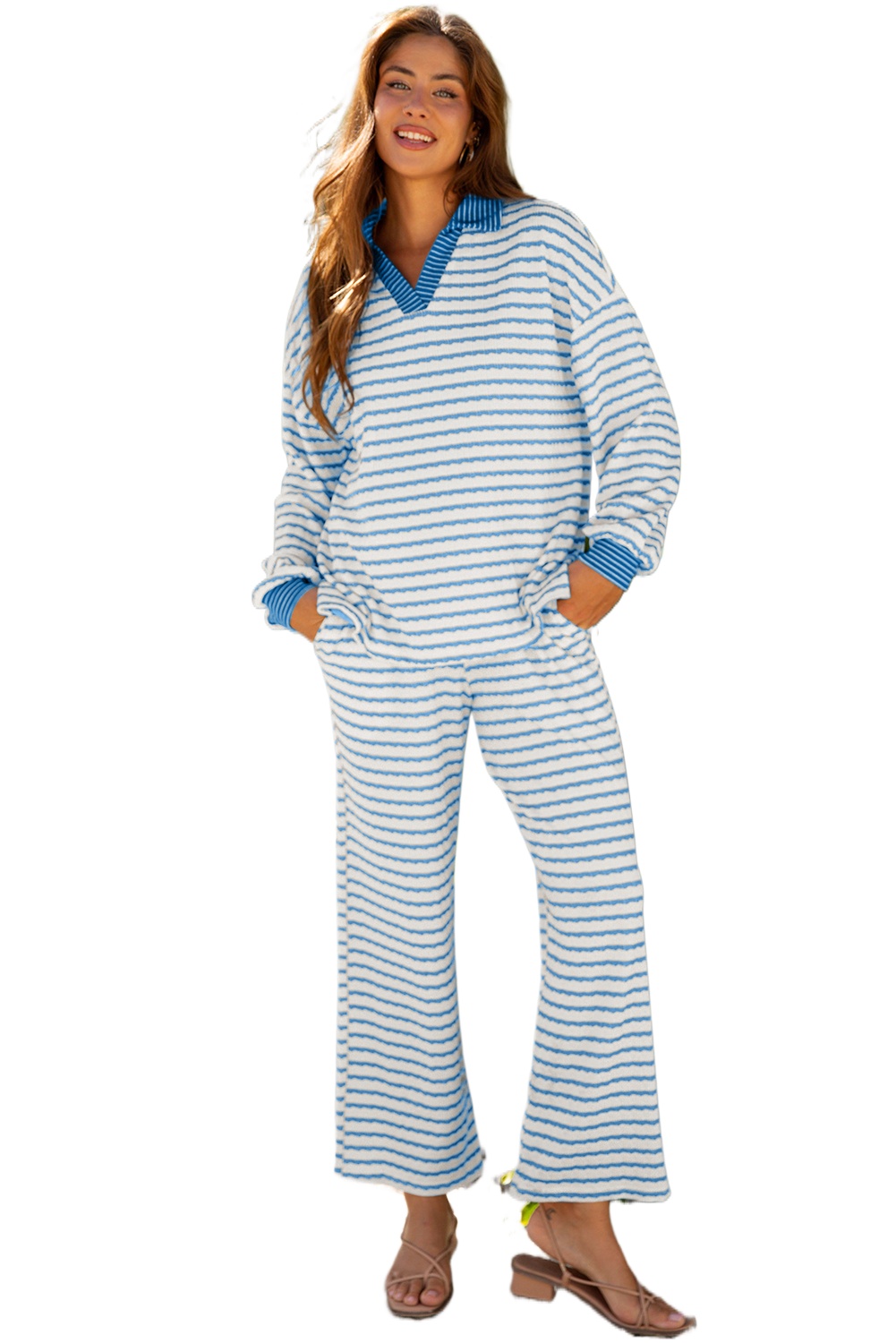 Women's Sky Blue Stripe Collared Pullover & Drawstring Pant Set – Cozy Casual Outfit for Daily Wear - Main ViewWomen’s Sky Blue Stripe Collared Pullover & Drawstring Pant Set – Cozy Casual Outfit for Daily Wear