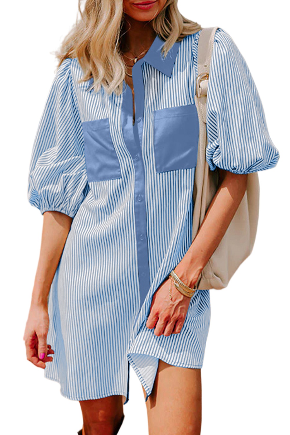 Women’s Sky Blue Stripe Color Block Mini Dress – Casual Puff Sleeve V Neck Style for Summer