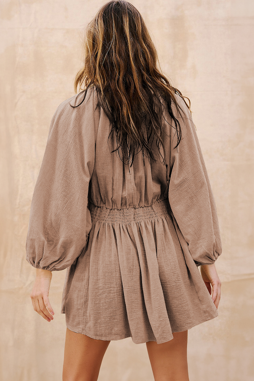 Women’s Smoke Gray Deep V Neck Bubble Sleeve Smocked Mini Dress for Daily Casual Wear