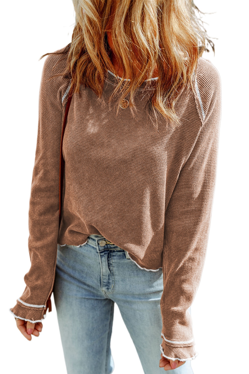 Women’s Smoke Gray Waffle Knit Long Sleeve Round Neck Top for Daily Casual Wear