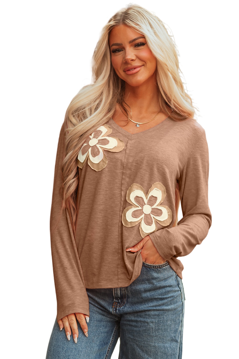 Women's Straw Yellow Floral Patchwork V-Neck Long Sleeve T-Shirt – Casual Daily Wear for Fall Days - Main ViewWomen’s Straw Yellow Floral Patchwork V-Neck Long Sleeve T-Shirt – Casual Daily Wear for Fall Days