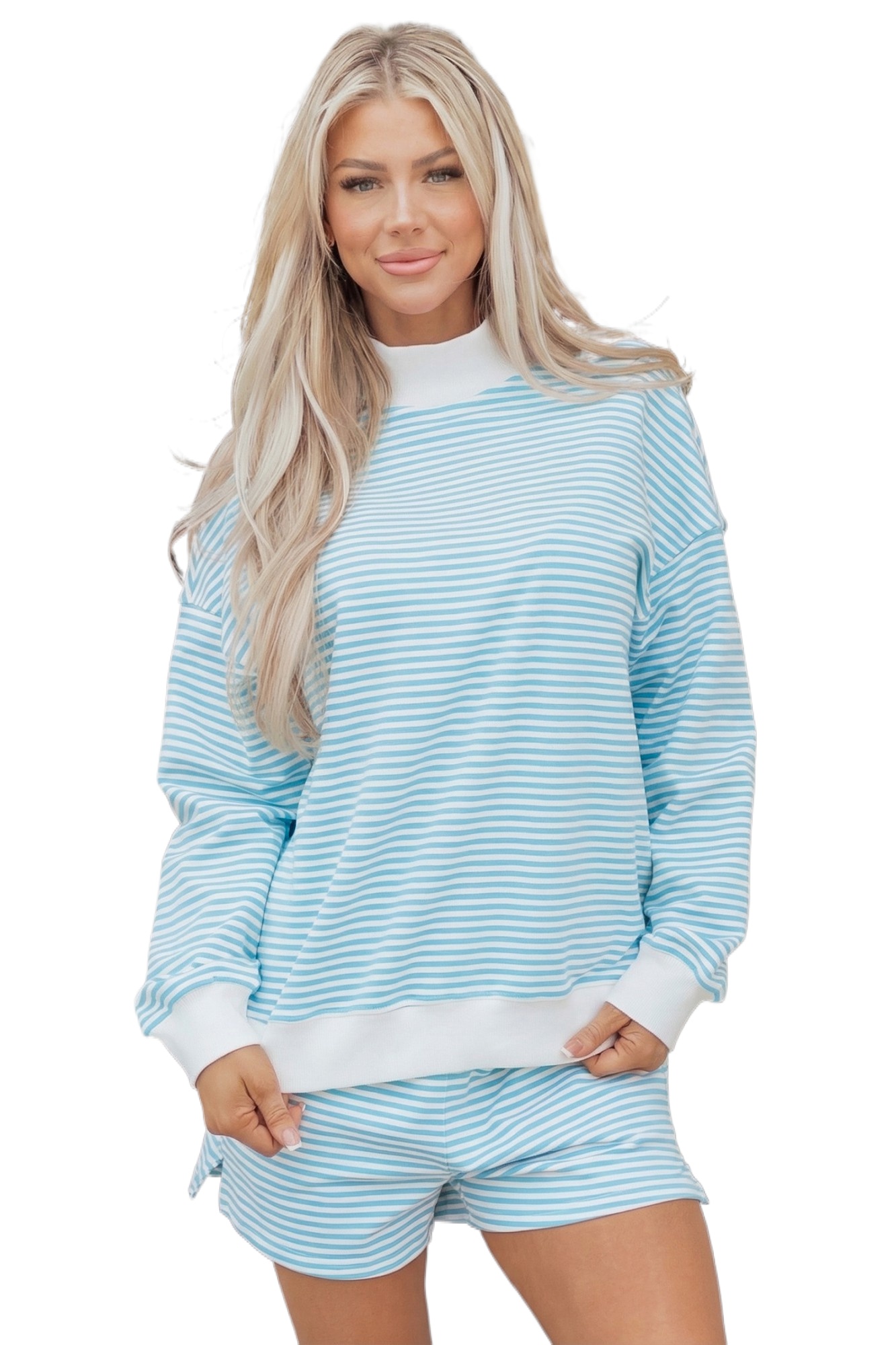 Women’s Striped Oversize Mock Neck Sweatshirt and Shorts Set – Sky Blue Casual Lounge Outfit