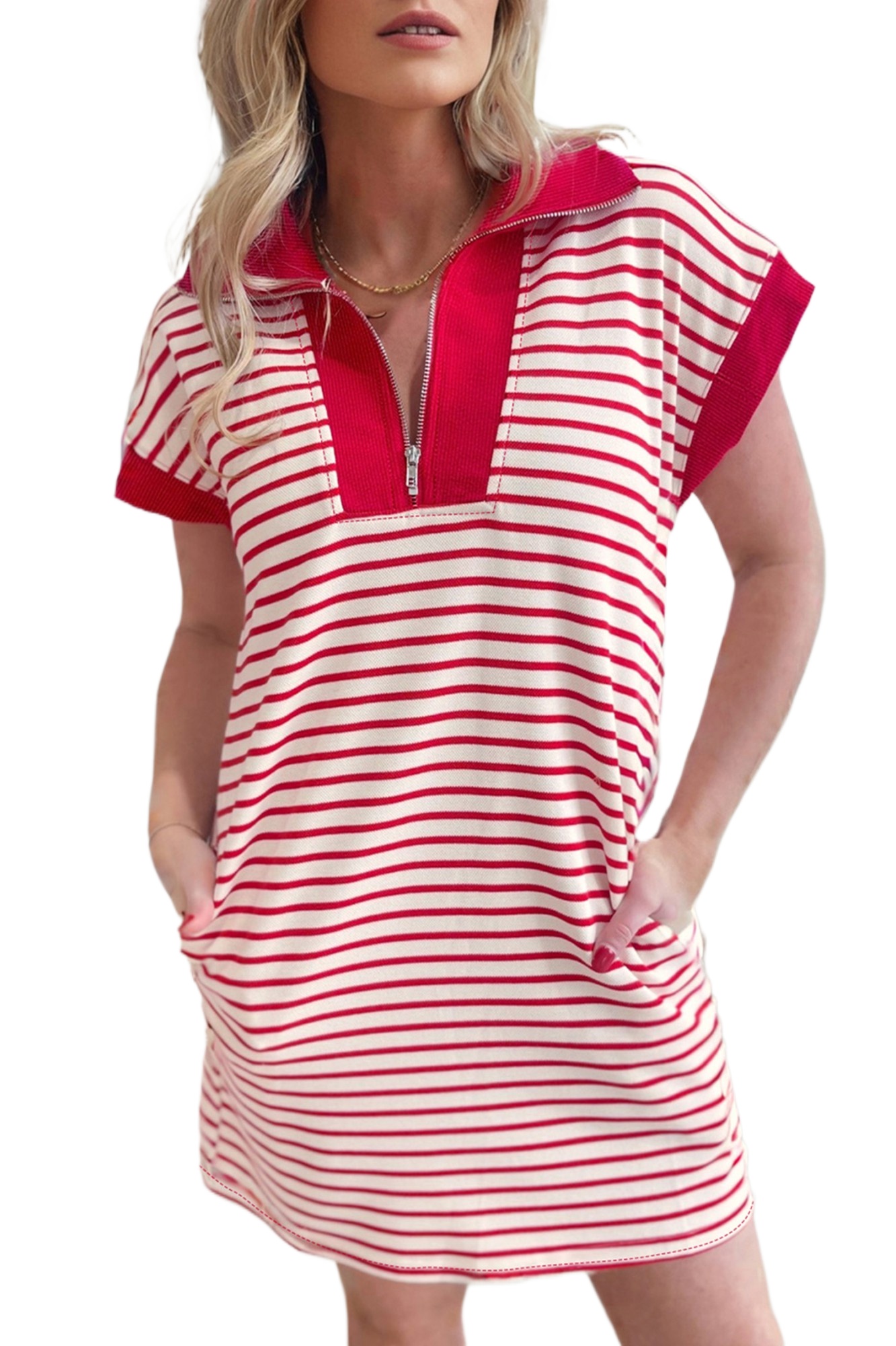 Women’s Striped Quarter Zip T-Shirt Dress – Casual Short Sleeve Shift Dress with Pockets