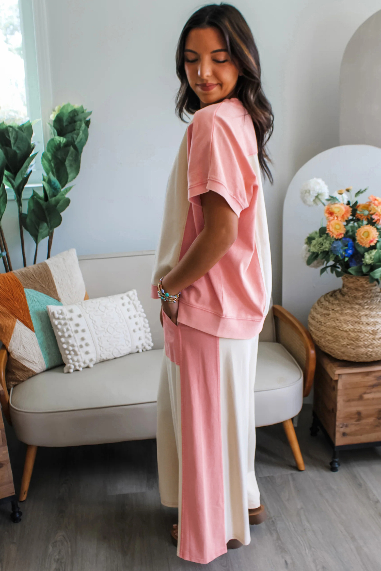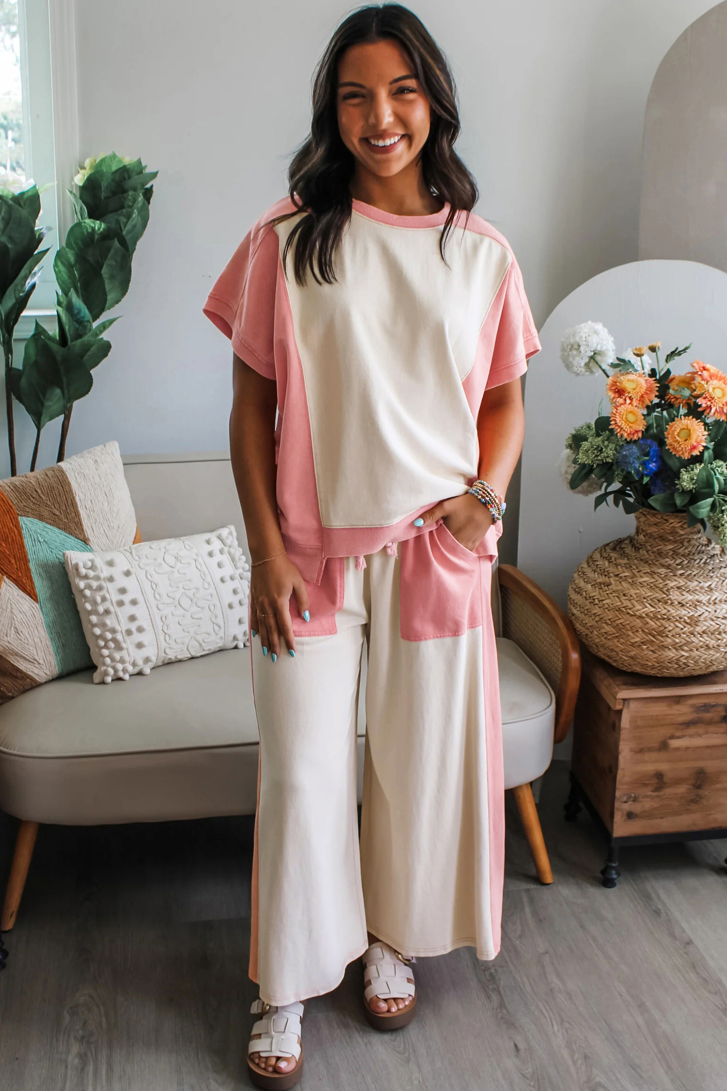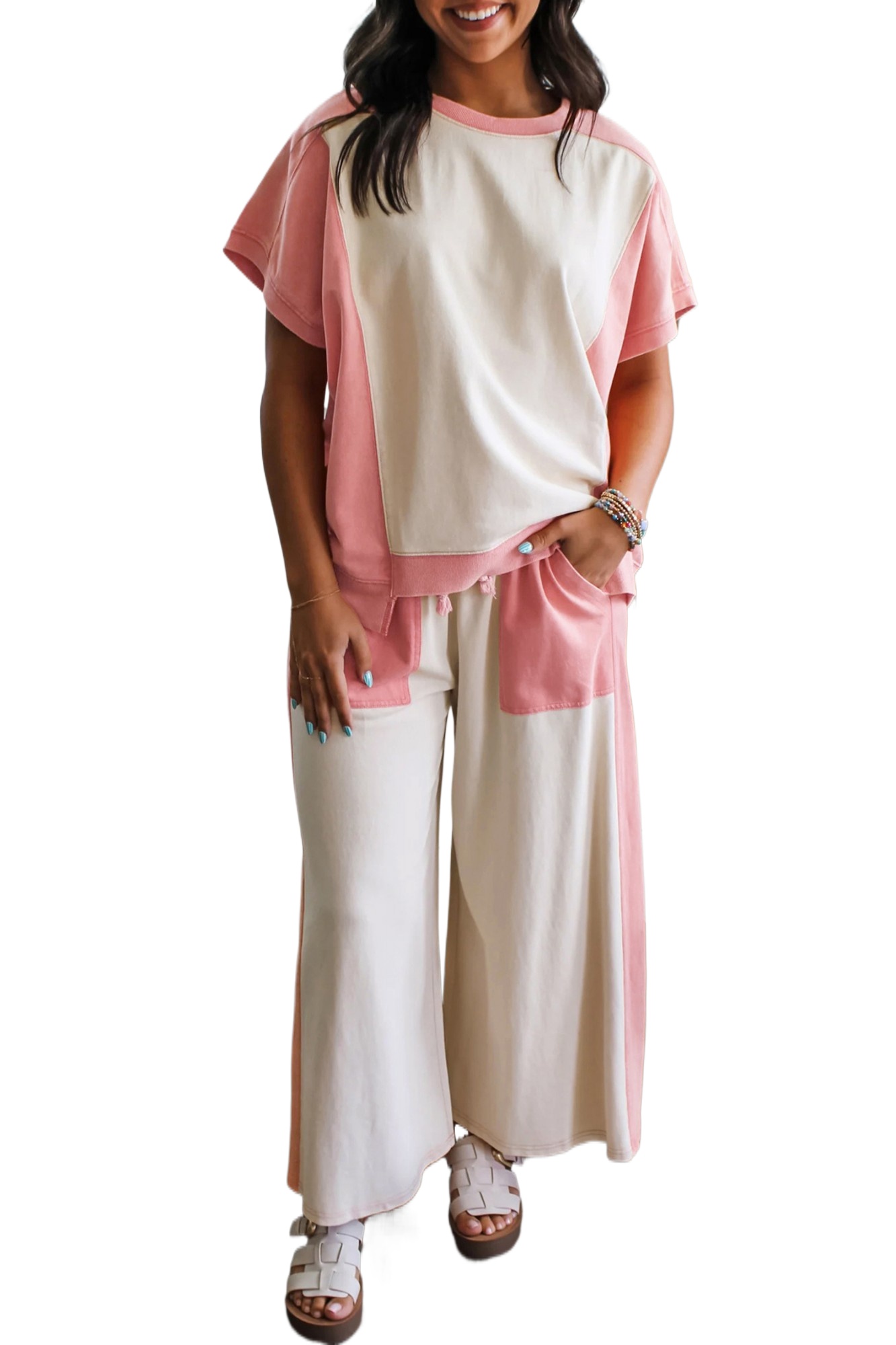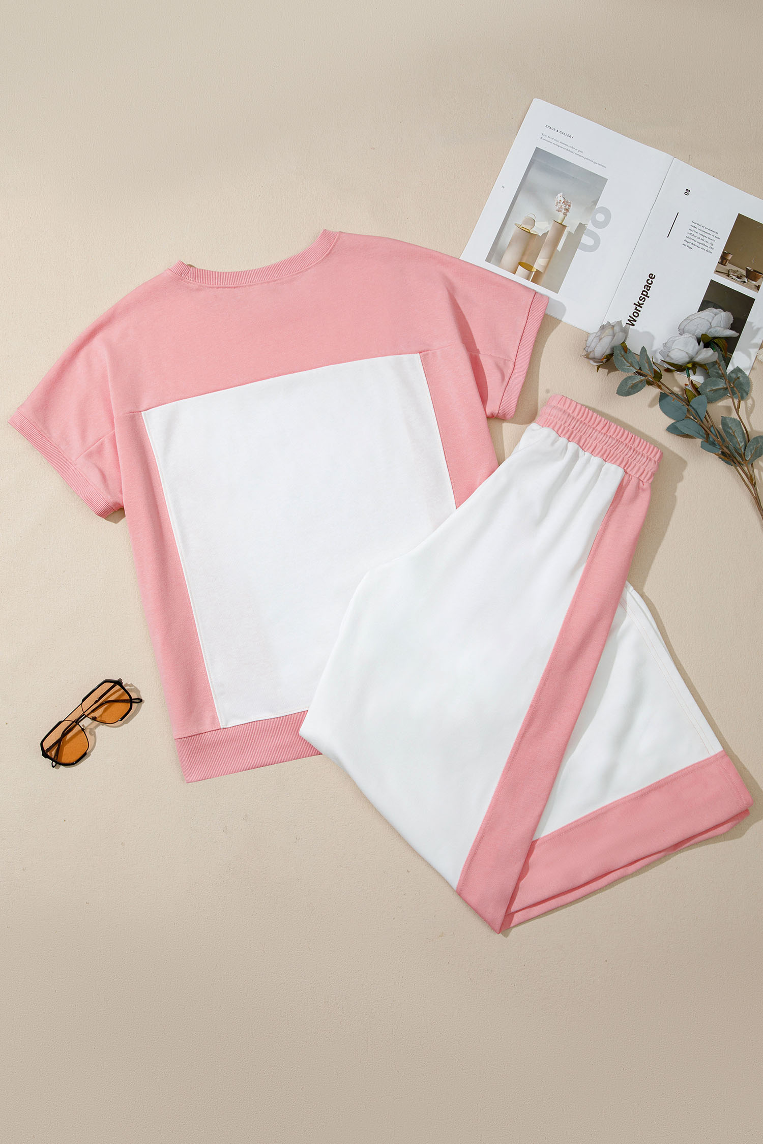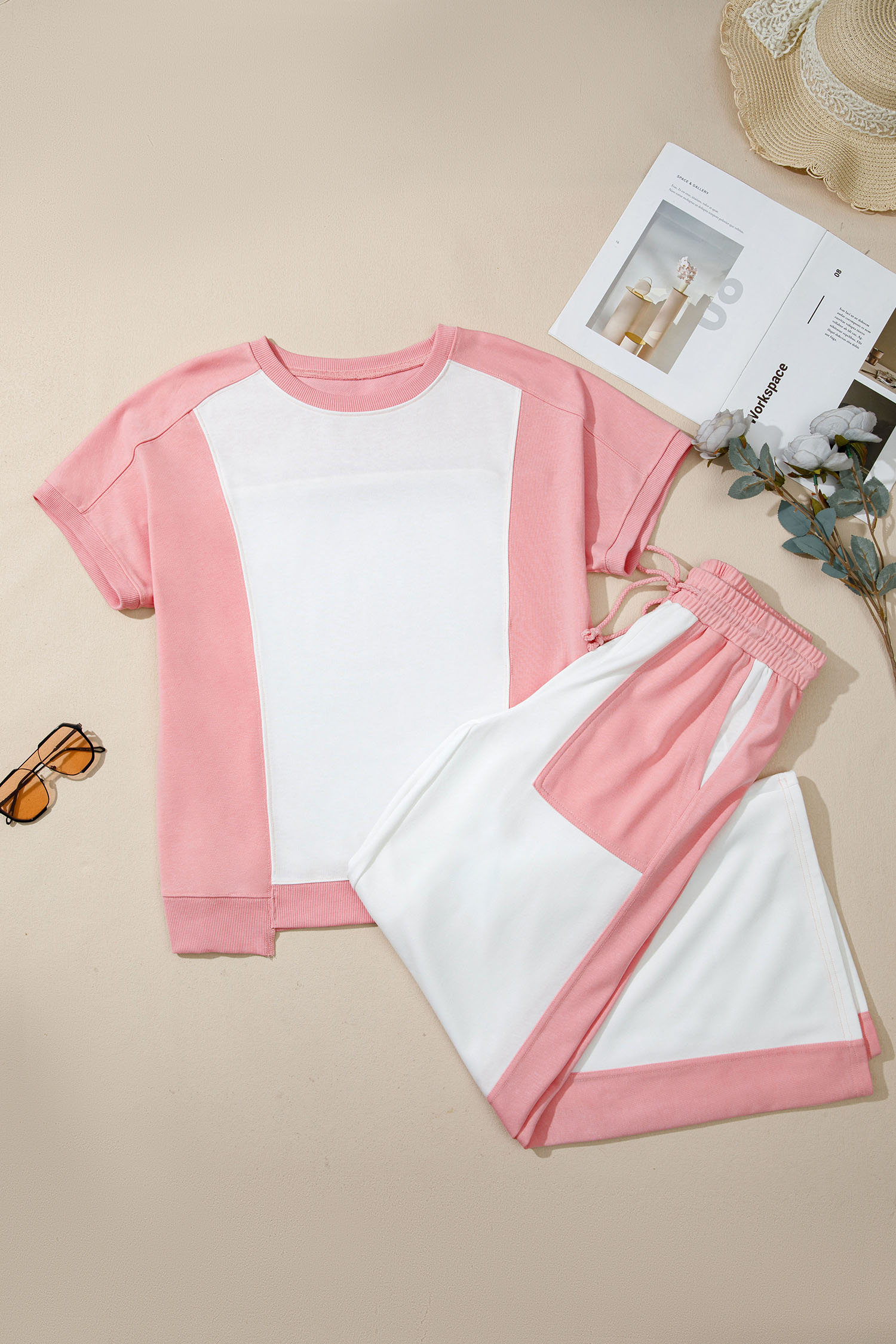 Women’s Two-Tone Color Block Lounge Set – Short Sleeve Patchwork Tee and Wide Leg Pants