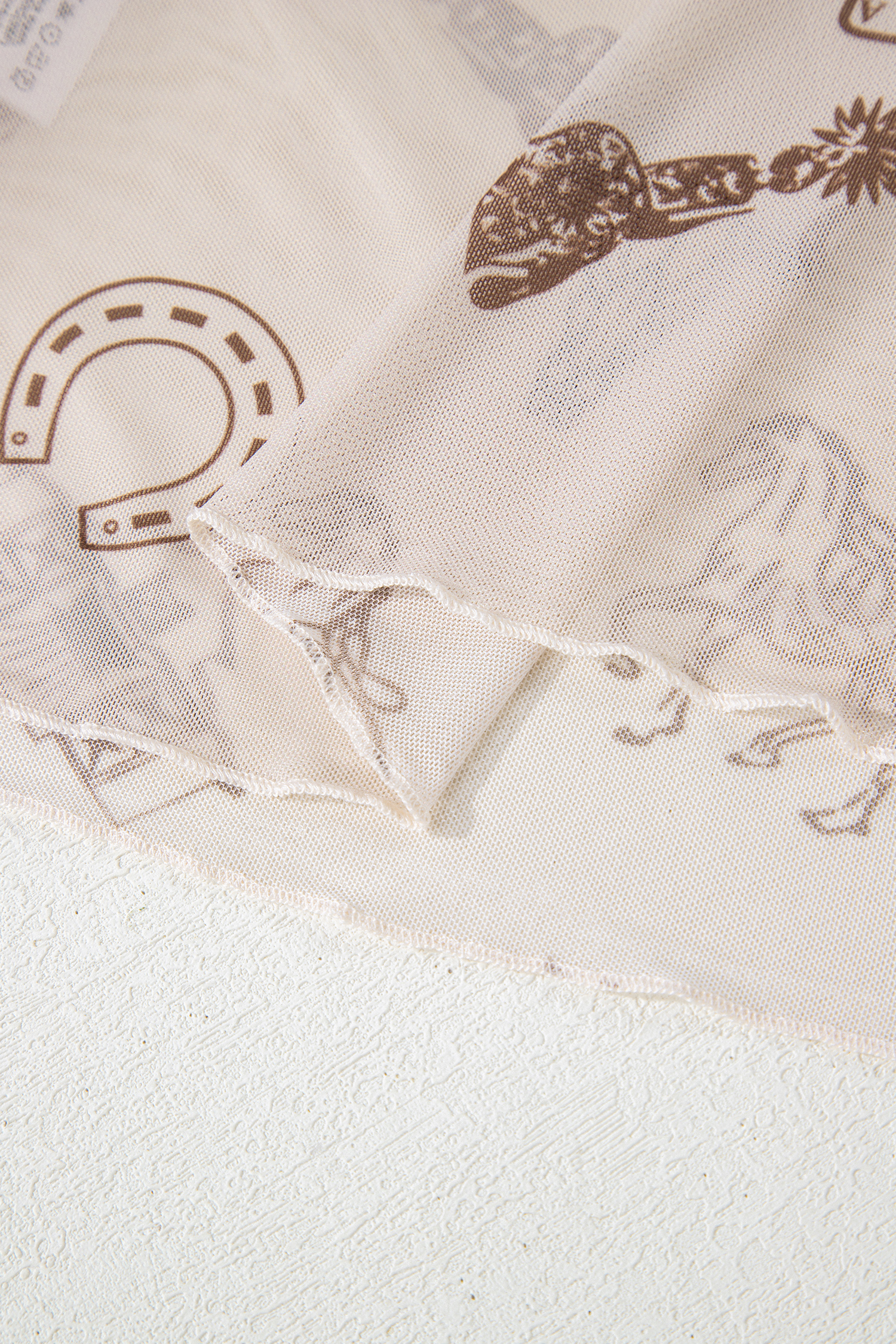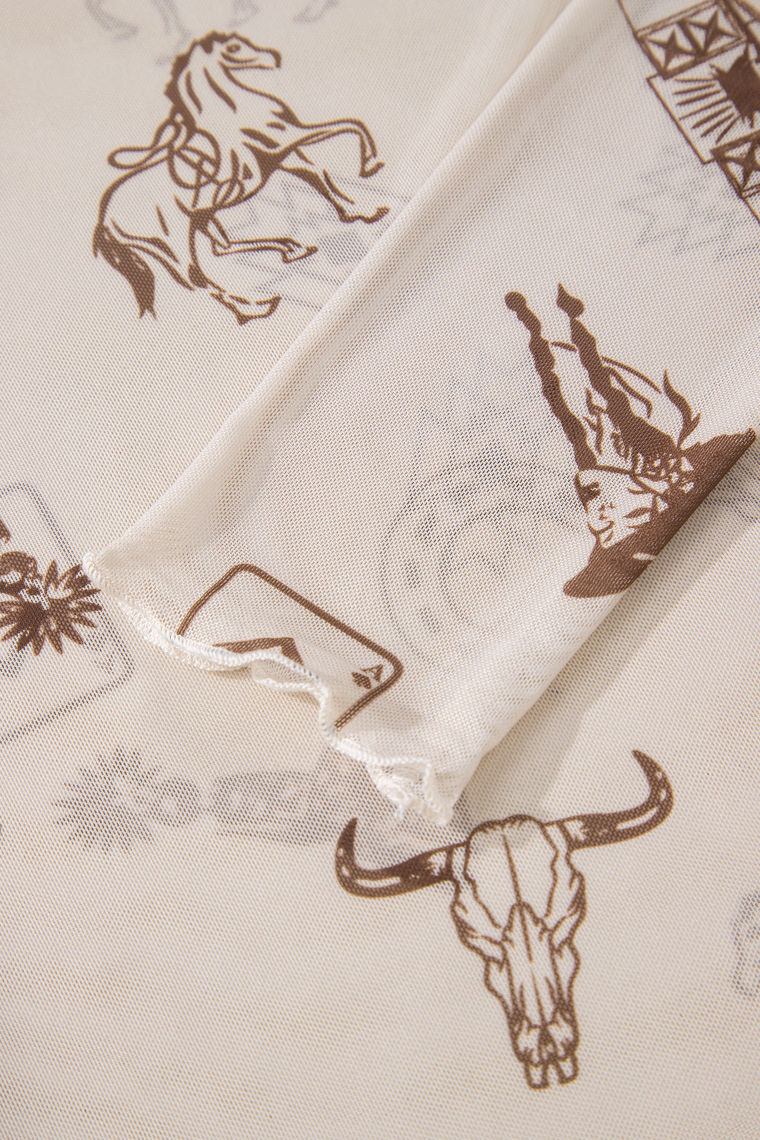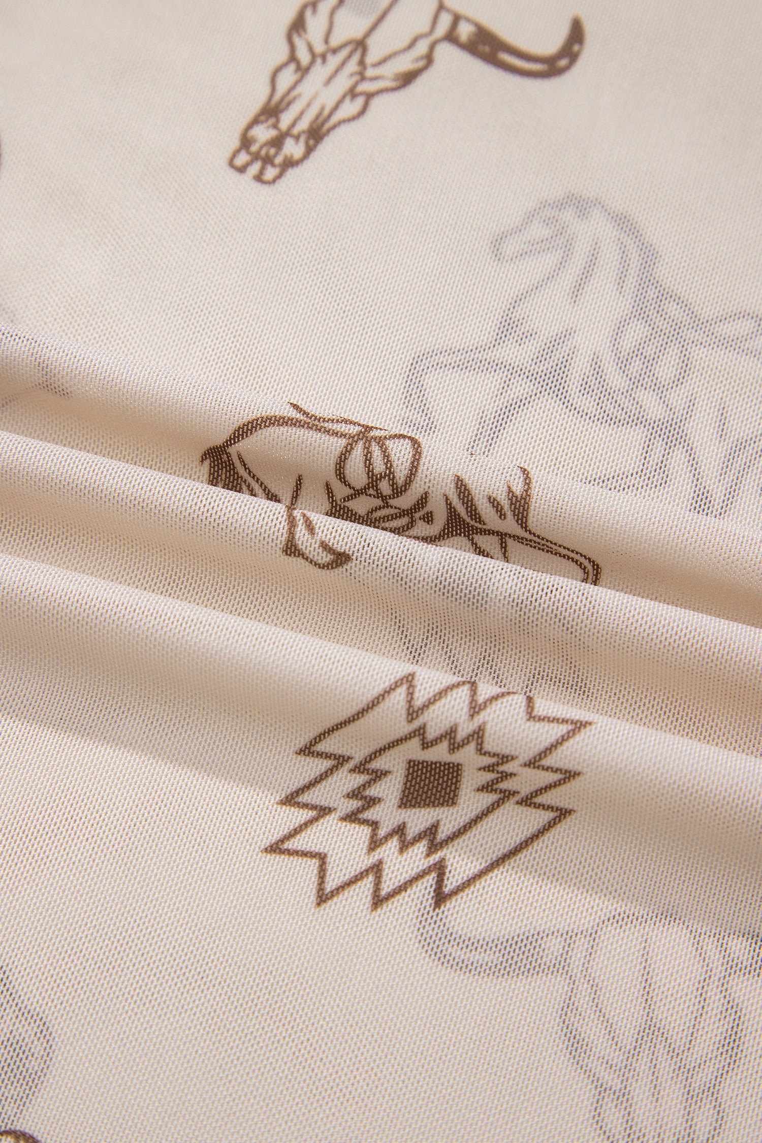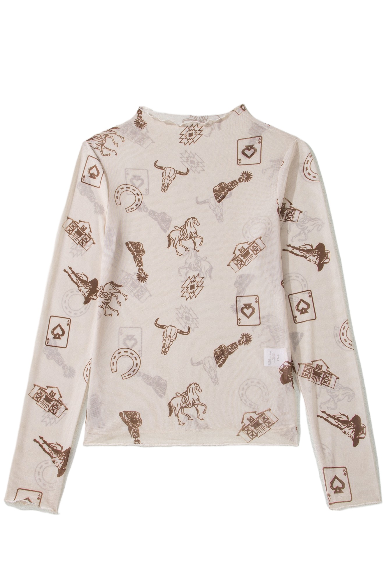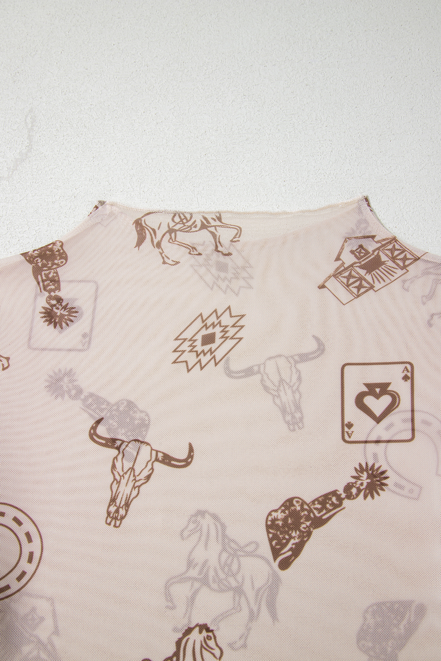 Women’s Western Print Mesh Long Sleeve Top – Slim Fit Mock Neck Shirt, Oatmeal Casual Style
