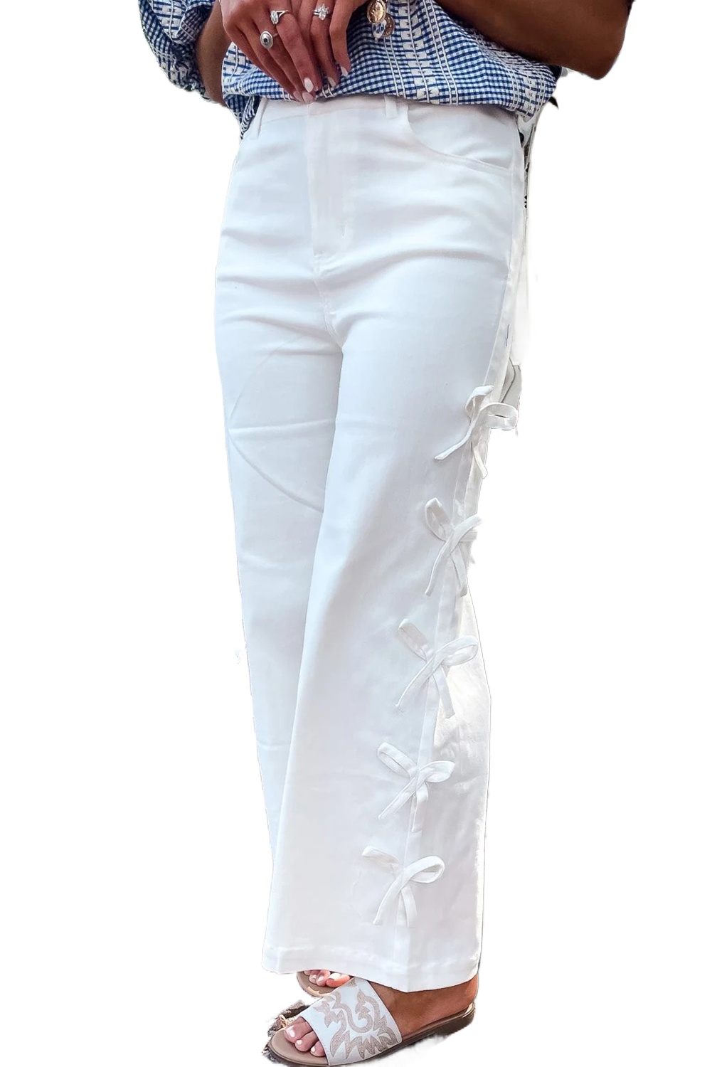 Women’s White Bow Knot Detail Wide Leg Jeans – Casual Daily Wear with Southern Belle Flair