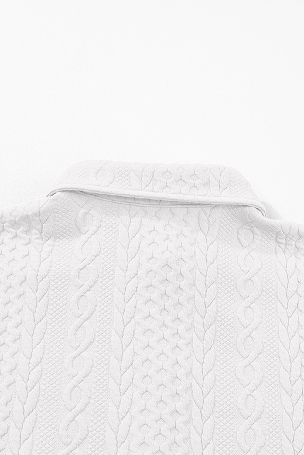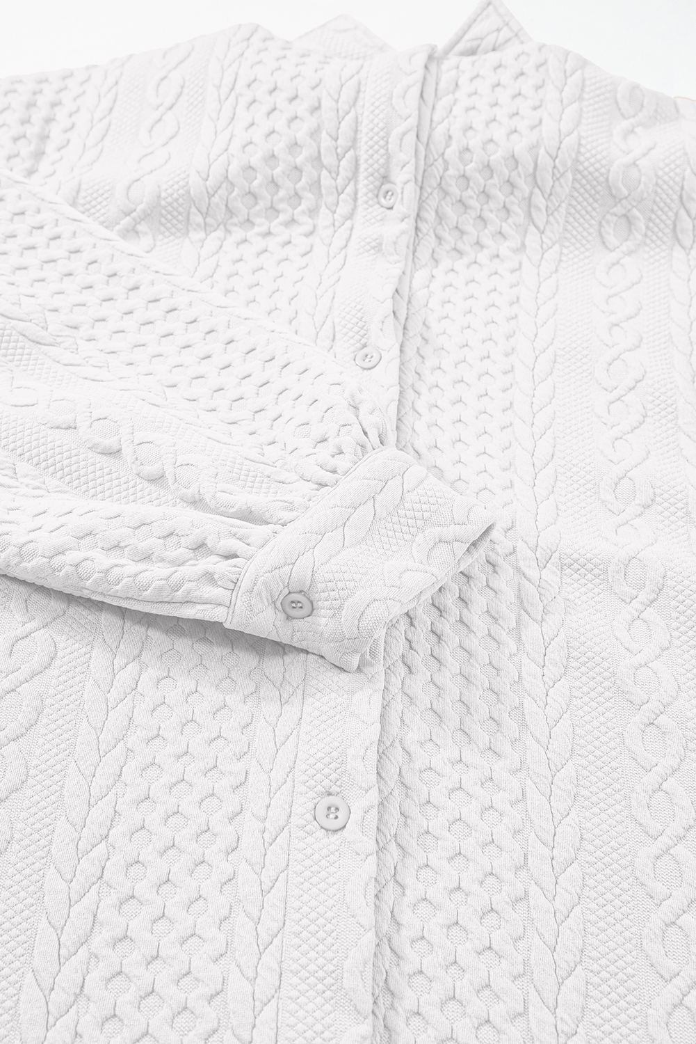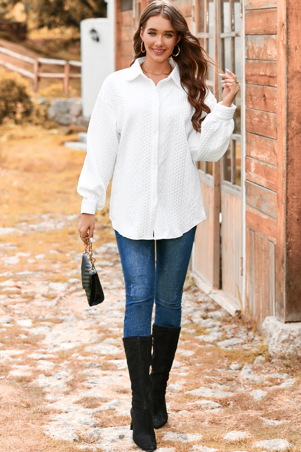 Women’s White Cable Texture Puff Sleeve Loose Shacket for Casual Fall Wear