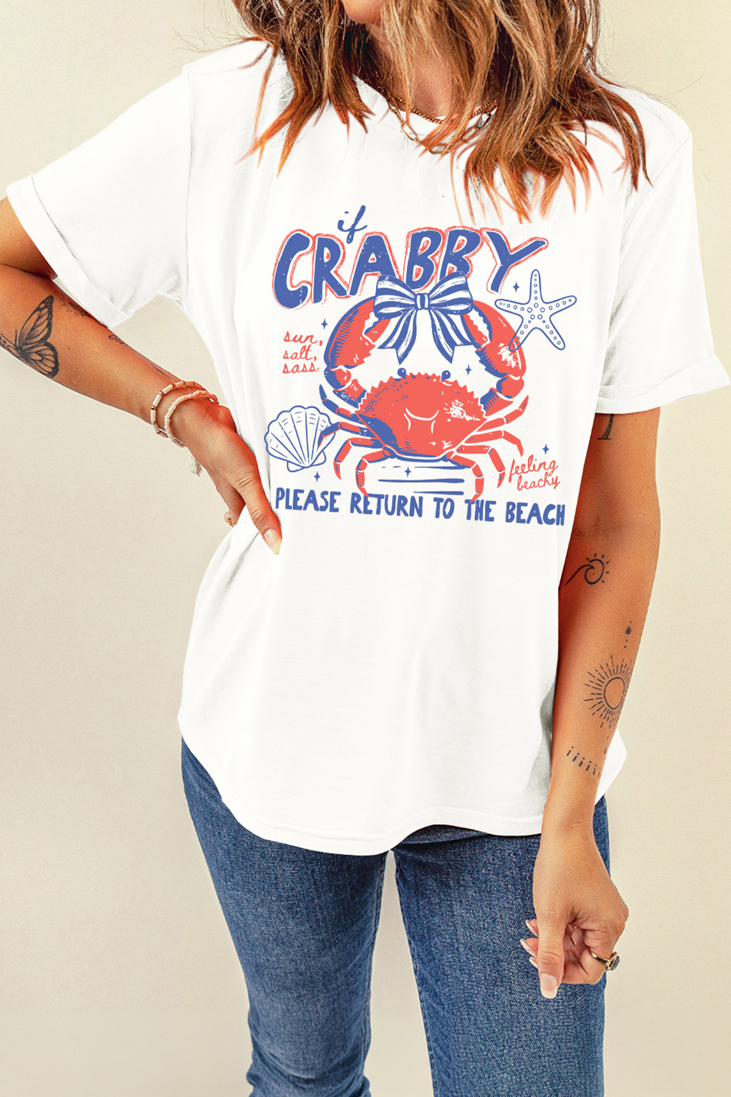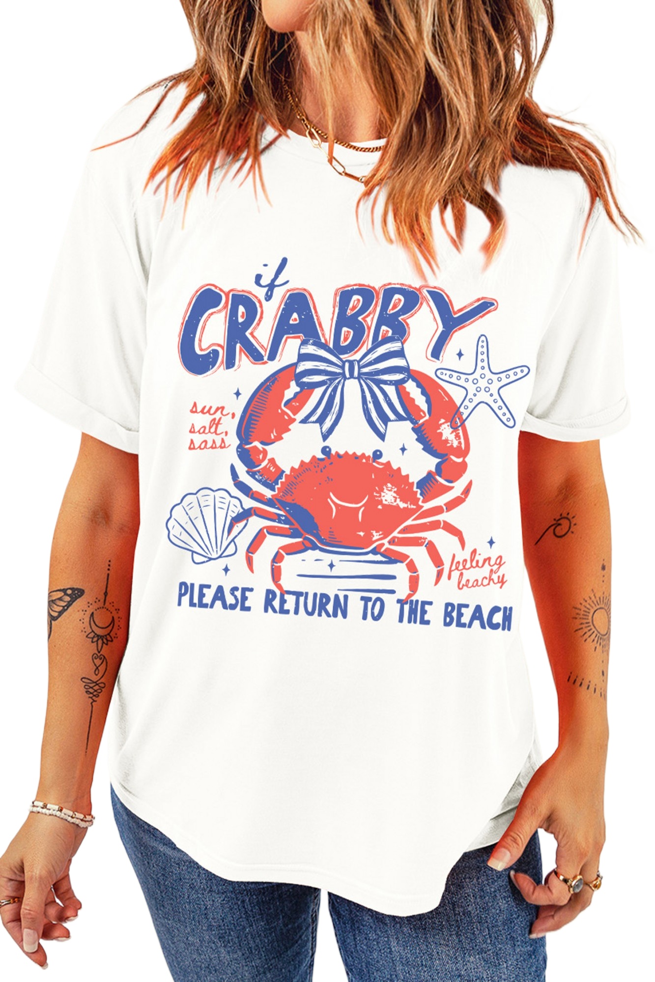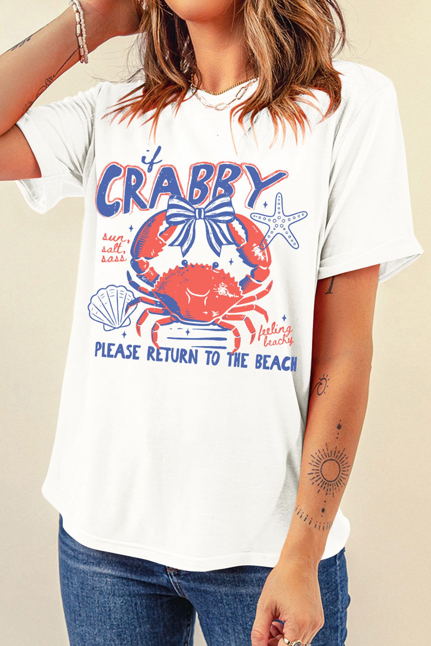 Women's White Crabby Graphic Tee – Short Sleeve Summer Vacation T-Shirt, Casual Round Neck Slogan TopWomen’s White Crabby Graphic Tee – Short Sleeve Summer Vacation T-Shirt, Casual Round Neck Slogan Top