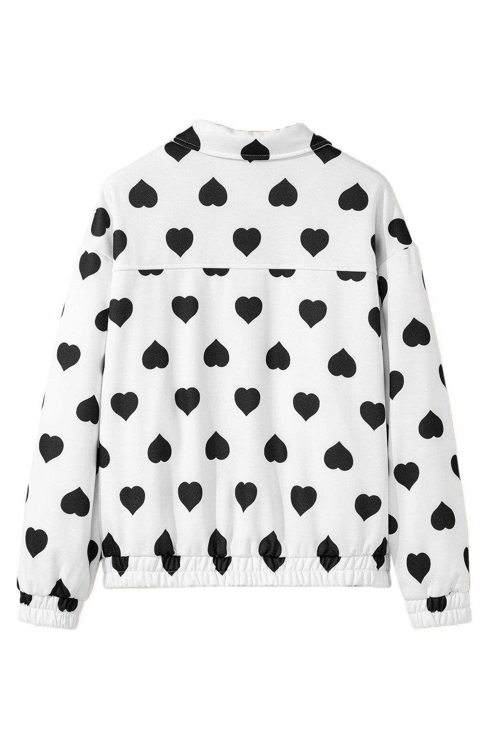 1. Charming Heart Print Design: The White Double Flap Pocket Heart Print Collar Zip Jacket features an adorable heart-shaped pattern, adding a playful touch to your autumn wardrobe.