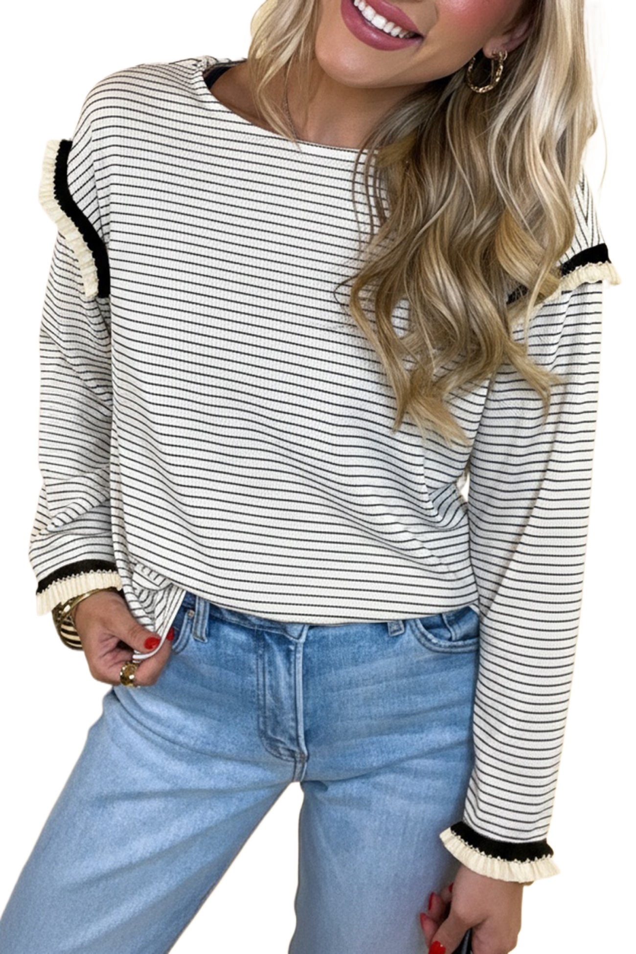 Women’s White Striped Ruffle Trim Long Sleeve Top for Daily Wear