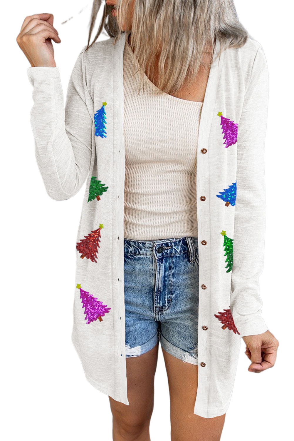 Women’s White V-Neck Sequin Christmas Tree Long Cardigan for Daily Wear