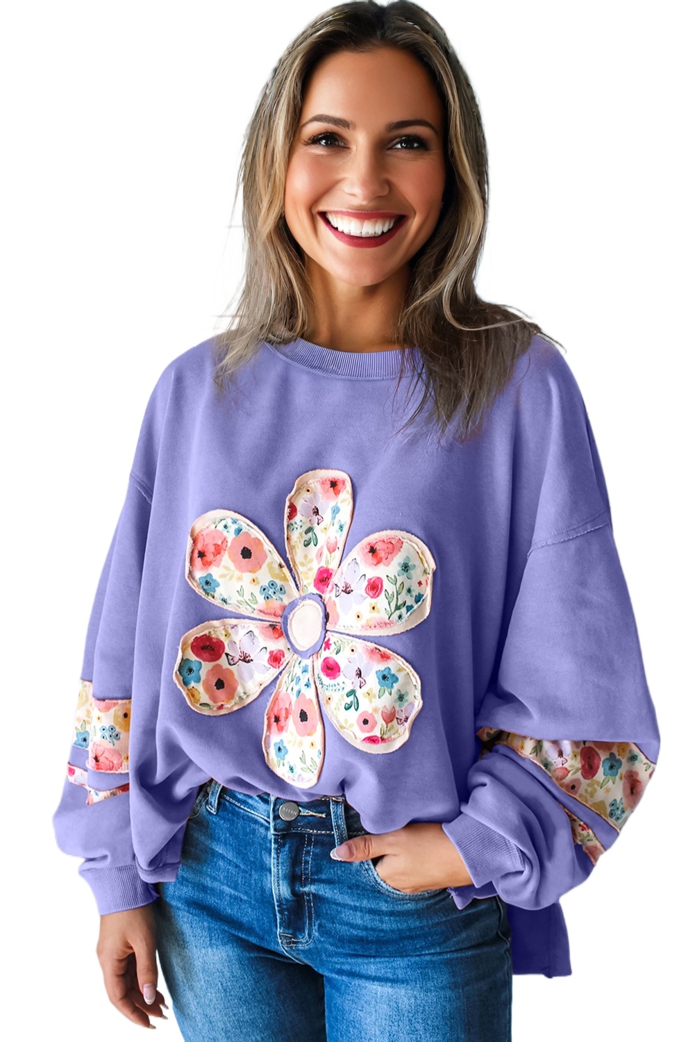 Women’s Wisteria Floral Applique Baggy Pullover Sweatshirt – Casual Daily Wear for Fall Comfort