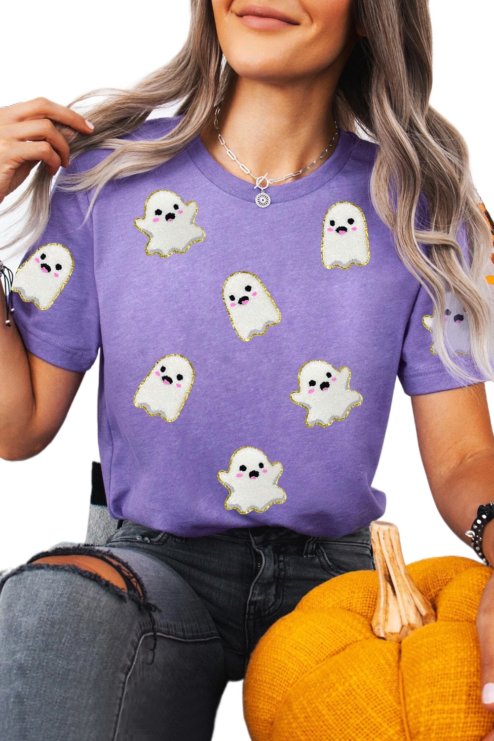 Women’s Wisteria Glitter Trim Chenille Ghost Patched Halloween Graphic Tee