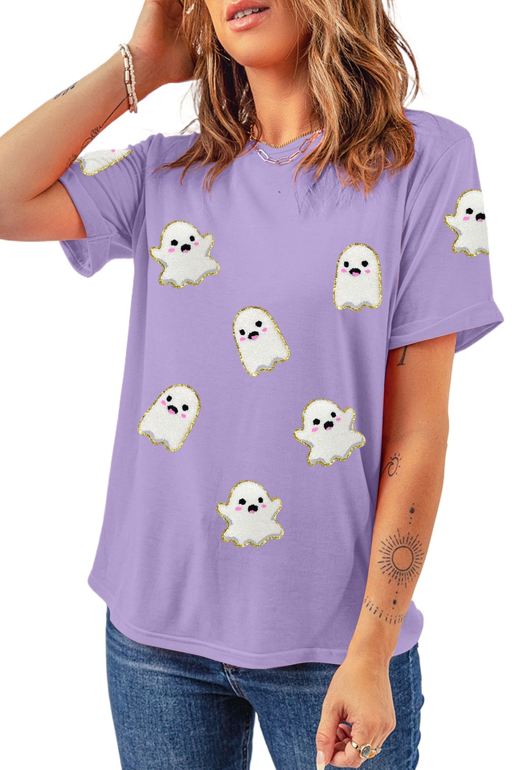 1. **Spooktacular Design**: The Wisteria Glitter Trim Chenille Ghost Patched Halloween Graphic Tee features an eye-catching ghost patch design that adds a playful touch to your Halloween wardrobe, making it perfect for festive celebrations.